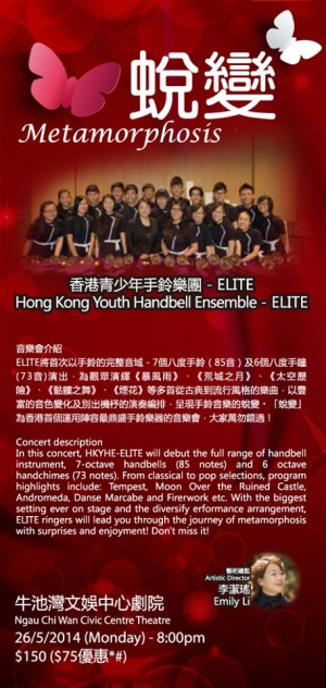 今年香港青少年手鈴樂團-ELITE將首次以手鈴的完整音域-7個八度手鈴(85音)及6個八度手鐘(73音)演出,為觀眾演繹《暴風雨》、《荒城之月》、《太空歷險》、《骷髏之舞》、《煙花》等多首從古典到流行風格的樂曲,以豐富的音色變化及別出機杼的演奏編排,呈現手鈴音樂的蛻變。「蛻變」為香港首個運用陣容最鼎盛手鈴樂器的音樂會,大家萬勿錯過!