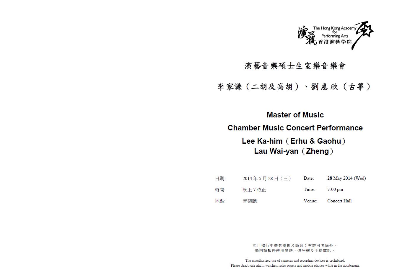 演藝音樂碩士生室樂音樂會—李家謙(二胡及高胡)、劉惠欣(古箏)