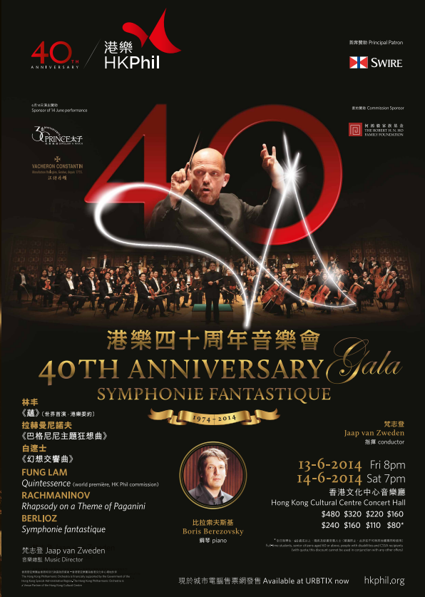 誠邀您同慶港樂四十周年!港樂慶祝第四十個精采樂季的壓軸盛會,音樂總監梵志登將演繹白遼士天馬行空的曠世傑作《幻想交響曲》,寓意港樂繼往開來。俄國鋼琴天王比拉索夫斯基更以一貫大鳴大放的俄式風格,與梵志登合演令人血脈沸騰的《巴格尼尼主題狂想曲》。土生土長的港樂駐團作曲家林丰則以全新作品《蘊》誌喜。 * 香港管弦樂團駐團作曲家及新作委約計劃由何鴻毅家族基金慷慨贊助。 請注意:6月14日(星期六)的音樂會於晚上七時正開始。