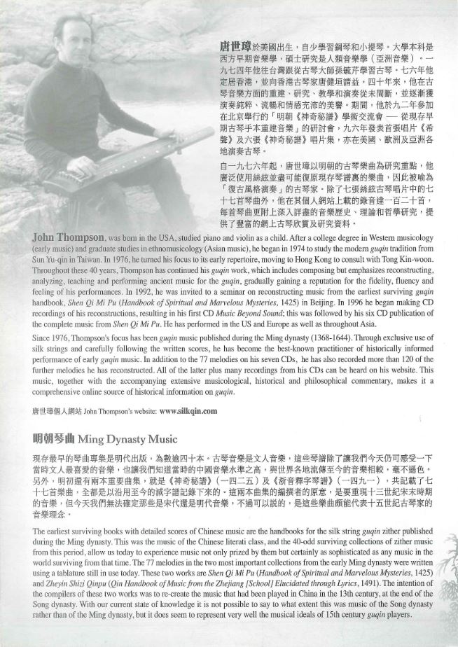 現存最早的琴曲專集是明代出版,為數逾四十本。古琴音樂是文人音樂,這些琴譜除了讓我們今天仍可感受一下當時文人最喜愛的音樂,也讓我們知道當時的中國音樂水準之高,與世界各地流傳至今的音樂相較,毫不遜色。另外,明初還有兩本重要曲集,就是《神奇秘譜》(一四二五)及《浙音釋字琴譜》(一四九一),共記載了七十七首樂曲,全都是以沿用至今的減字譜記錄下來的。這兩本曲集的編撰者的原意,是要重現十三世紀宋末時期的音樂,但今天我們無法確定那些是宋代還是明代音樂,不過可以說的,是這些樂曲頗能代表十五世紀古琴家的音樂理念。