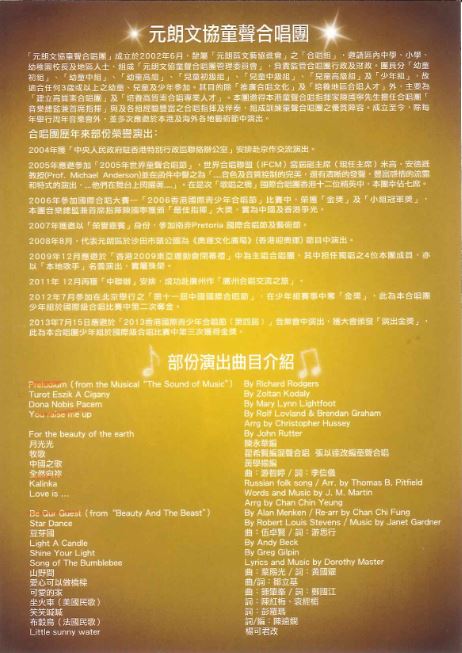 樂曲Preludium (from the Musical "The Sound of Music") 樂曲牧歌(翟希賢編混聲合唱, 張以逹改編童聲合唱) 樂曲Kalinka (Russian folk song, Arr. by Thomas B. Pitfield) 樂曲Be Our Guest (from "Beauty And The Beast", Re-arr by Chan Chi Fung)
