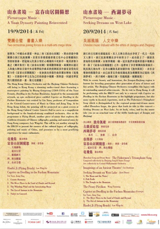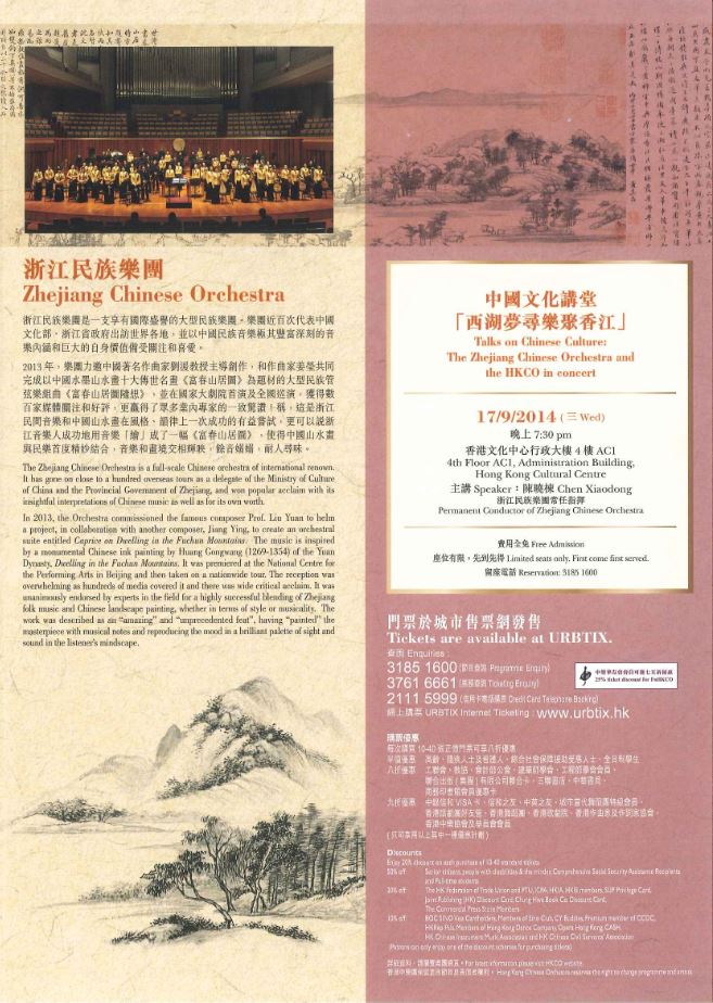 《西湖夢尋》 吳越風韻 人文中樂 浙江的文化歷史源遠流長,其人文與自然山水孕育了一代又一代的文人雅士。浙江民族樂團在多年的努力下,成功建立了一個深具當地特色的樂團,在樂界獨樹一幟。這次他們來港與香港中樂團合作,除了《富春山居圖隨想》之外,也帶來了多首樂團的保留曲目,既有風行海內外,以舟山鑼鼓為素材創作的《漁舟凱歌》,亦有音樂會的點題作品,由已故著名作曲家錢兆熹為樂團度身訂造的《西湖夢尋》。西子湖畔,錢塘江潮,吳越風韻,兩團展現!