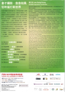 狂吹猛打新世界 樂團的本地中樂精英羅行良,特別為您策劃一套從傳统到現代、南方到北方的曲目,由樂團的吹管聲部及敲擊聲部精彩演繹。林樂培大師的《祝賀吹打序樂》與伍敬彬的《離離》,更會讓您一睹香港吹打樂的創作剪影。