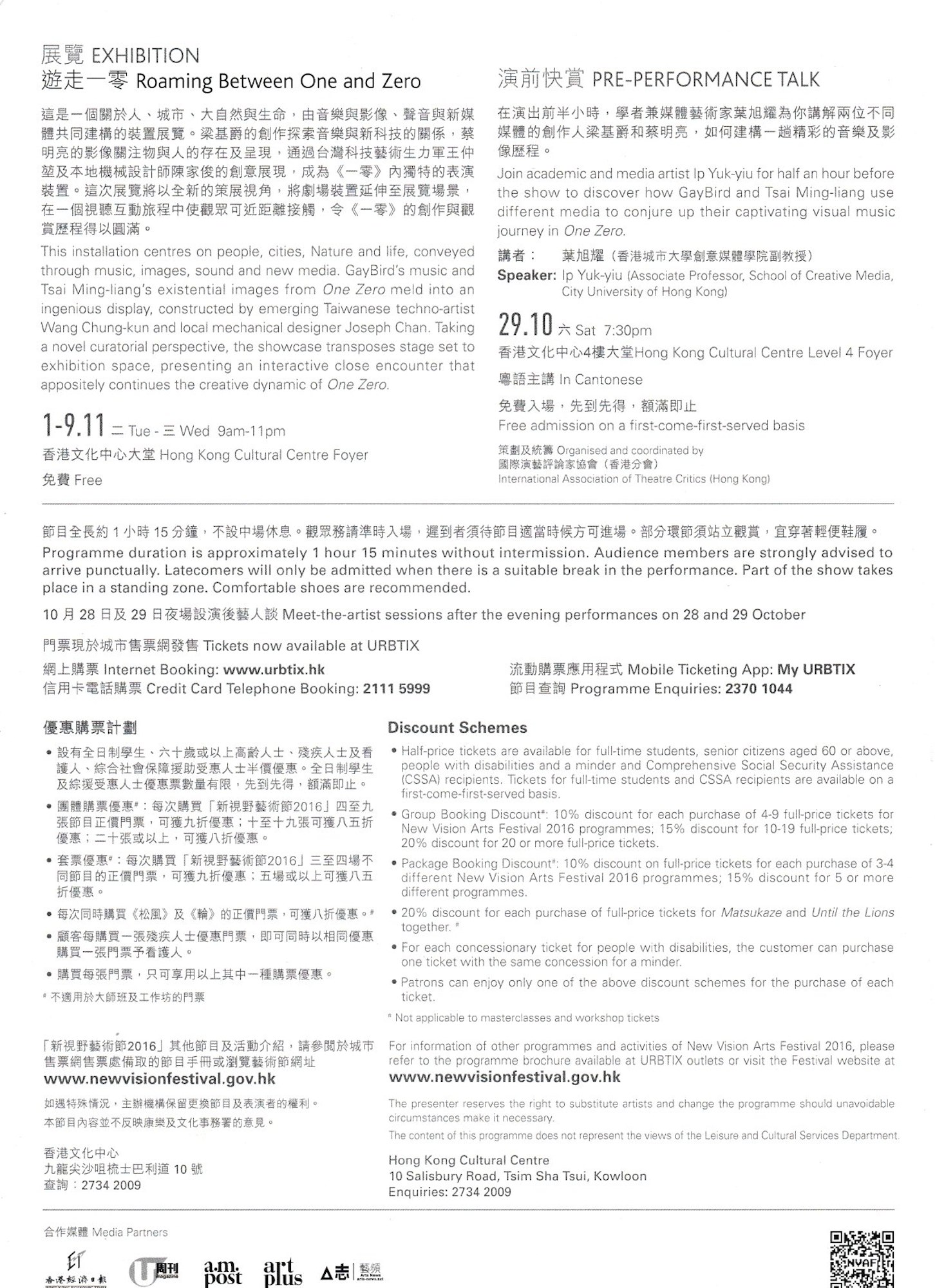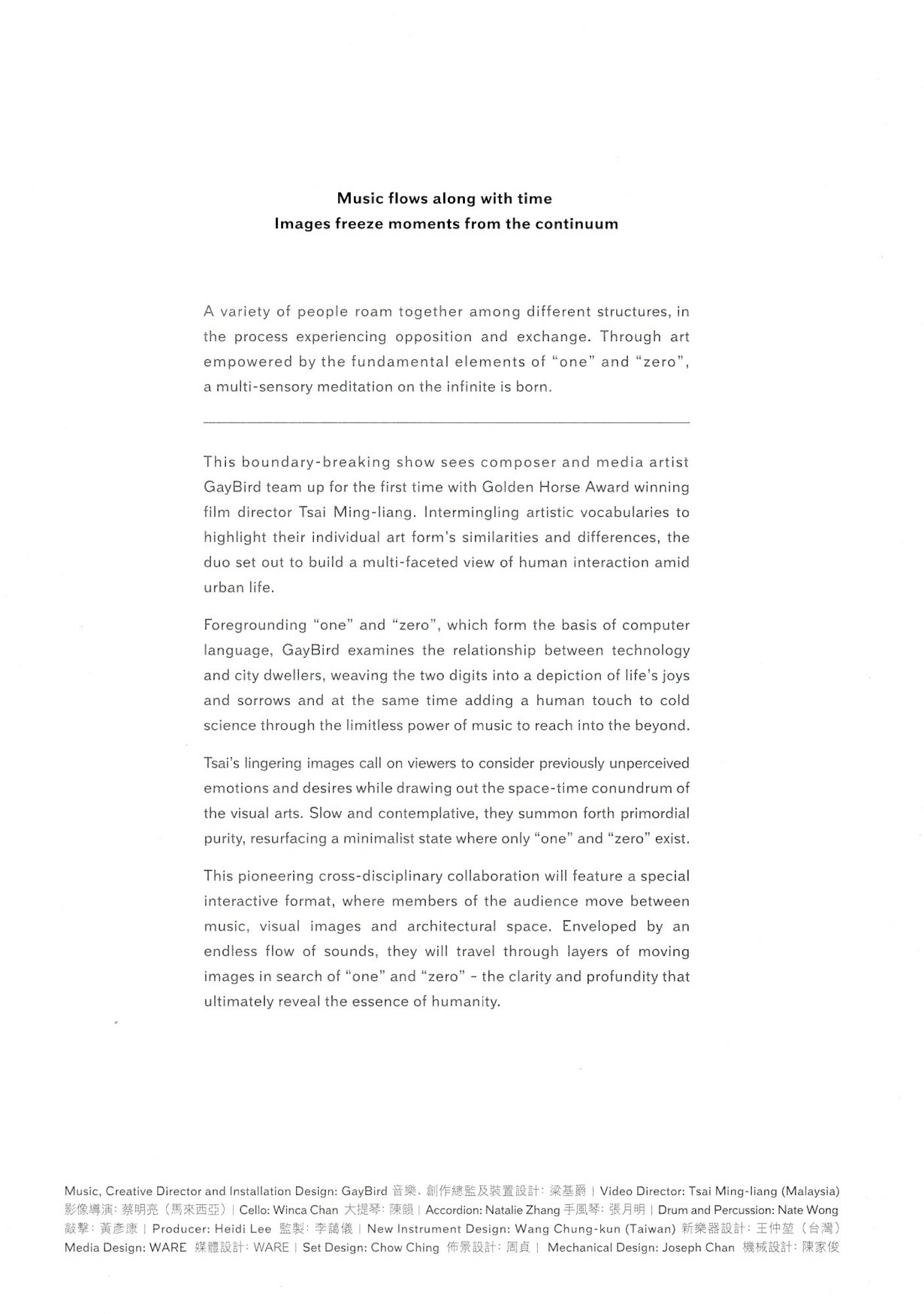 音樂跟著時間流動,影像把時空停留。人與各種元素共同遊走在不同建構中,體驗從對立到對調,再延伸到對應的過程,穿梭於「一」和「零」最簡約的元素中,再而進化至無盡的多維空間。