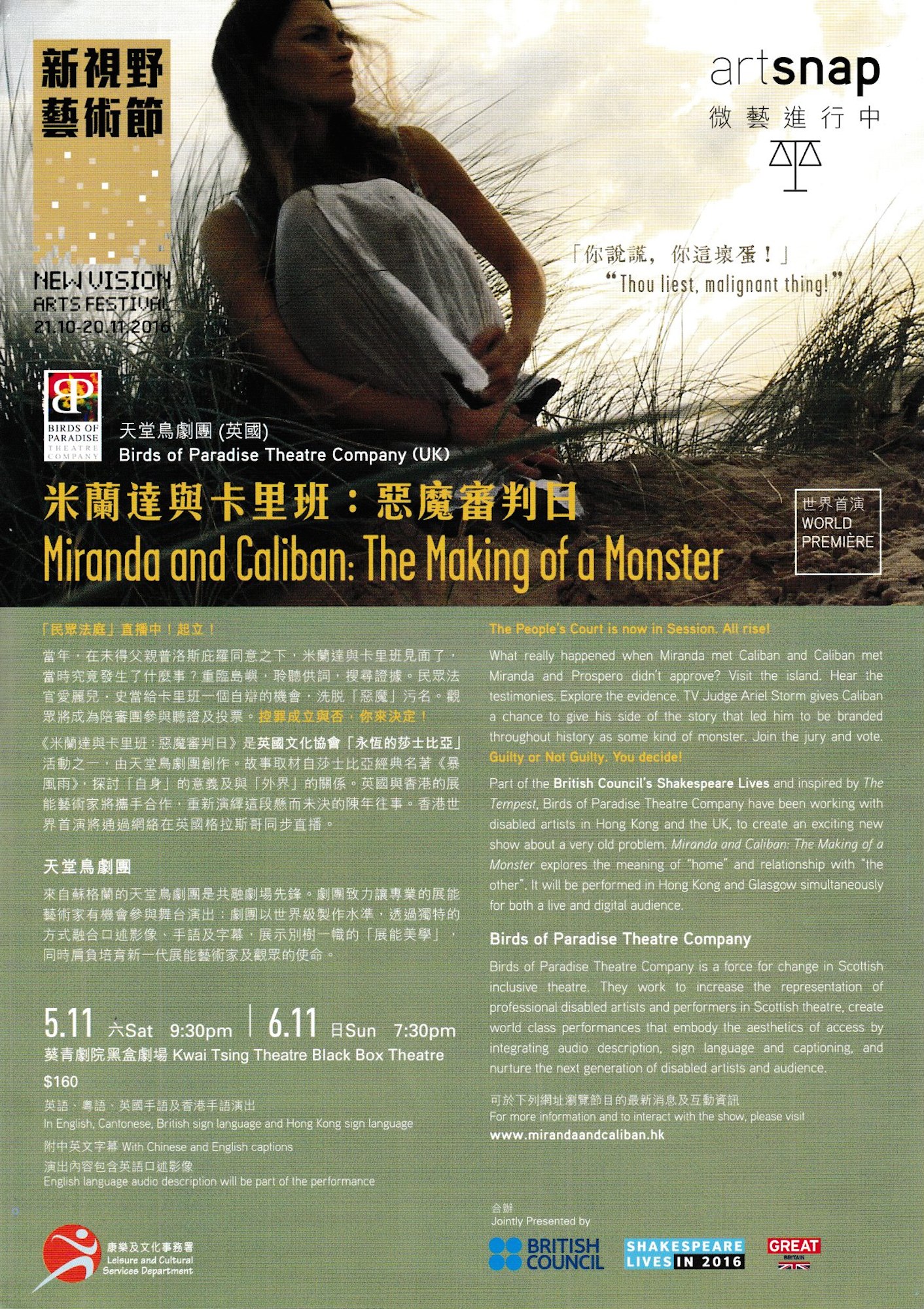 《米蘭達與卡里班:惡魔審判日》是英國文化協會「永恆的莎士比亞」活動之一,由天堂鳥劇團創作。故事取材自莎士比亞《暴風雨》,探討「家」的意義及與「外來者」的關係。英國與香港的聽障和展能藝術家將攜手合作,為觀衆帶來耳目一新的法庭審判劇。香港世界首演將通過網絡在英國格拉斯哥同步直播。
