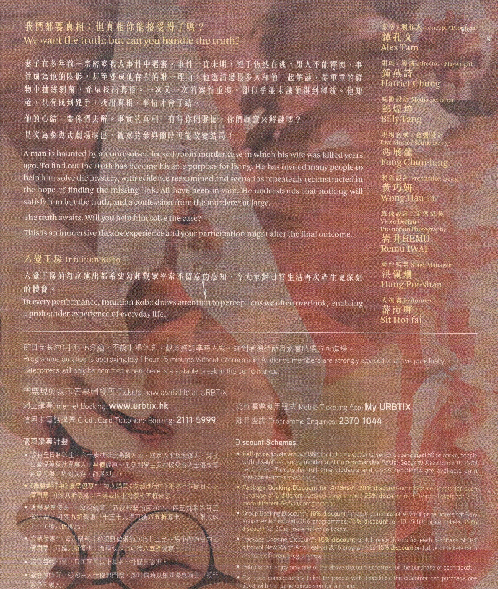 我們都要真相;但真相你能接受得了嗎?妻子在多年前一宗密室殺人事件中遇害,事件一直未明,兇手仍然在逃。男人不能釋懷,事件成為他的陰影,甚至變成他存在的唯一理由。他邀請過很多人和他一起解謎,從重重的證物中抽絲剝繭,希望找出真相。一次又一次的案件重演,卻似乎並未讓他得到釋放。他知道,只有找到兇手,找出真相,事情才會了結。他的心結,要你們去解。事實的真相,有待你們發掘。你們願意來解謎嗎?是次為參與式劇場演出,觀眾的參與隨時可能改變結局!