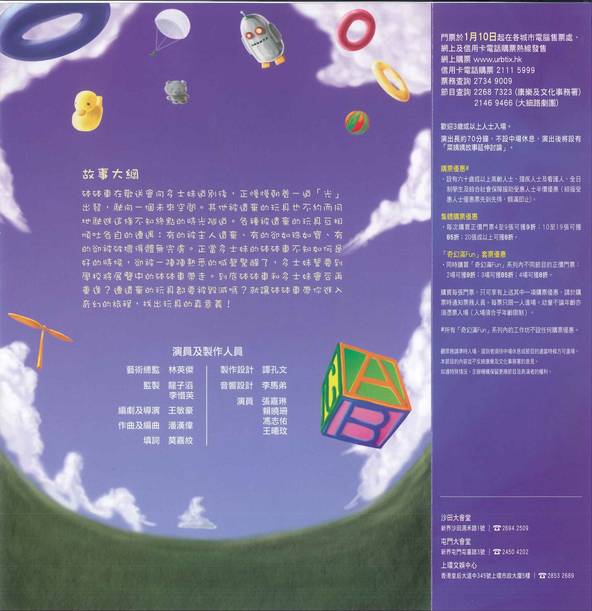 砵砵車在歡送會向多士妹道別後,正慢慢朝著一道「光」出發,駛向一個未來空間。其他被遺棄的玩具也不約而同地駛進這條不知終點的時光隧道。各種被遺棄的玩具互相傾吐各自的遭遇:有的被主人遺棄,有的被破壞得體無完膚,但有的卻如珠如寶地被珍惜。正當多士妹的砵砵車不知如何是好的時候,卻被一陣陣熟悉的喊聲驚醒了,多士妹誓要到學校將展覽中的砵砵車帶走。到底砵砵車和多士妹會否再重逢?遭遺棄的玩具都要被毀滅嗎?就讓砵砵車帶你進入奇幻的旅程,找出玩具的真意義!