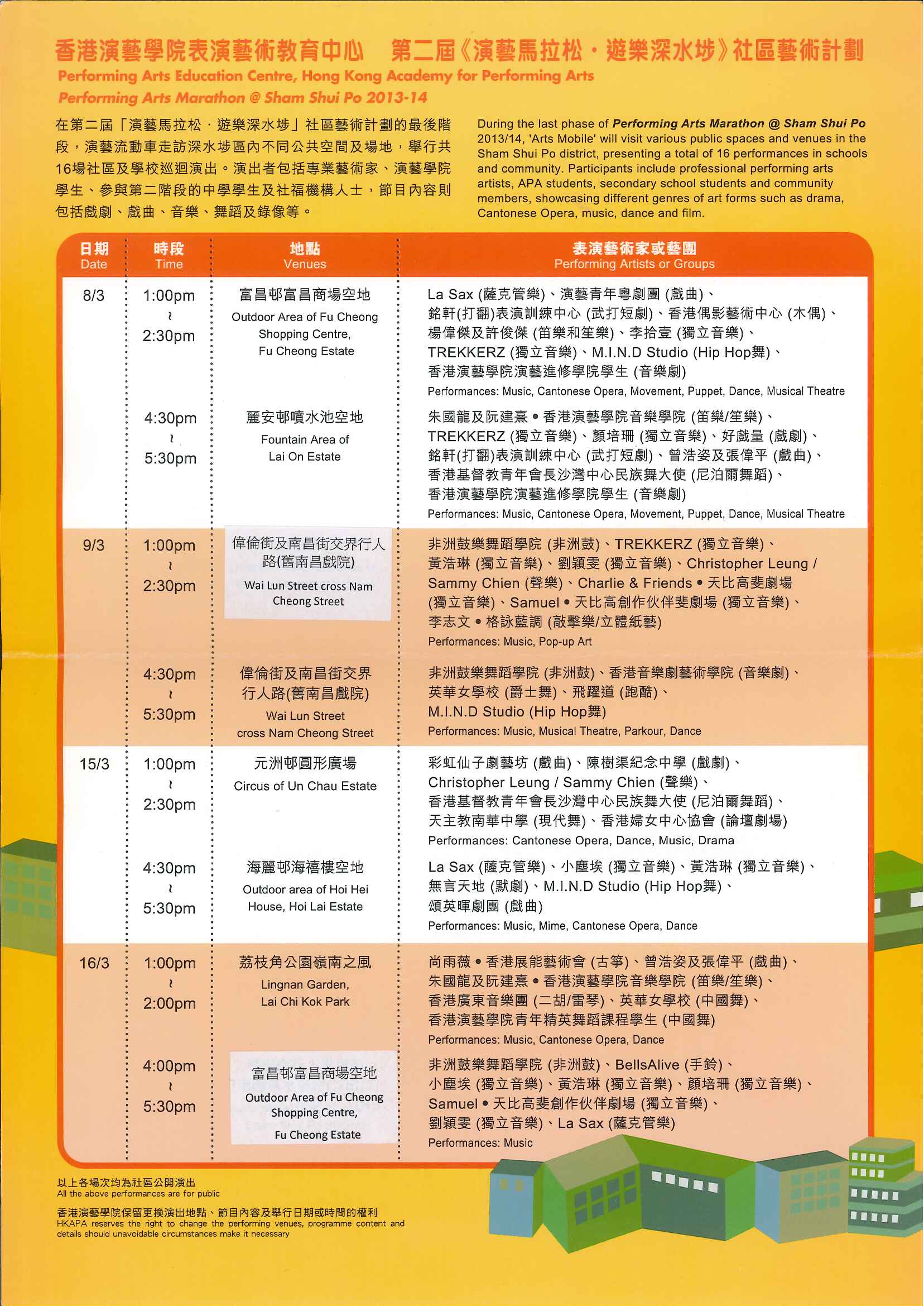 2013年,本中心再獲Bloomberg機構贊助,推行第二屆《演藝馬拉松.遊樂深水埗》社區藝術計劃。續往開來,計劃目的將表演藝術帶入社群, 與社會文化脈絡結合,進而凝聚社區意識,提升及豐富本地文化生活,並透過區內學生及社區人士的參與,為他們帶來寶貴的藝術學習經驗。