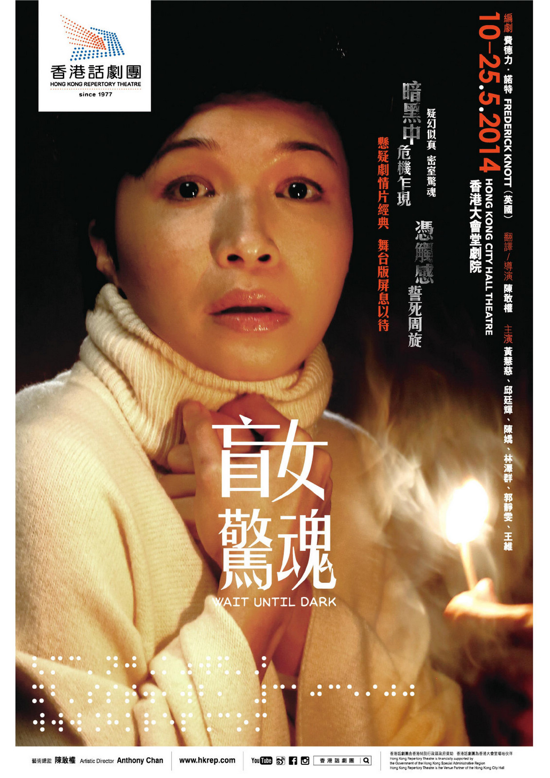 《盲女驚魂》的電影版(1967)由柯德莉夏萍主演 ,廣受歡迎,並憑著精彩情節、巧妙的場景設計以至戲中營造的驚悚氛圍,榮獲多項奧斯卡金像獎及金球獎提名,堪稱懸疑片類型的經典。原裝舞台版《盲女驚魂》由藝術總監陳敢權翻譯及執導,以貼近時代的手法勾勒人性黑暗面,帶領觀眾親歷驚魂記,為新劇季揭開序幕!
