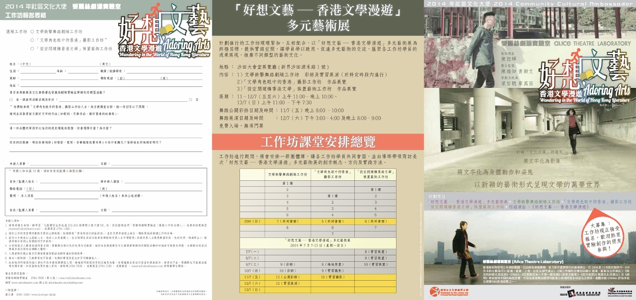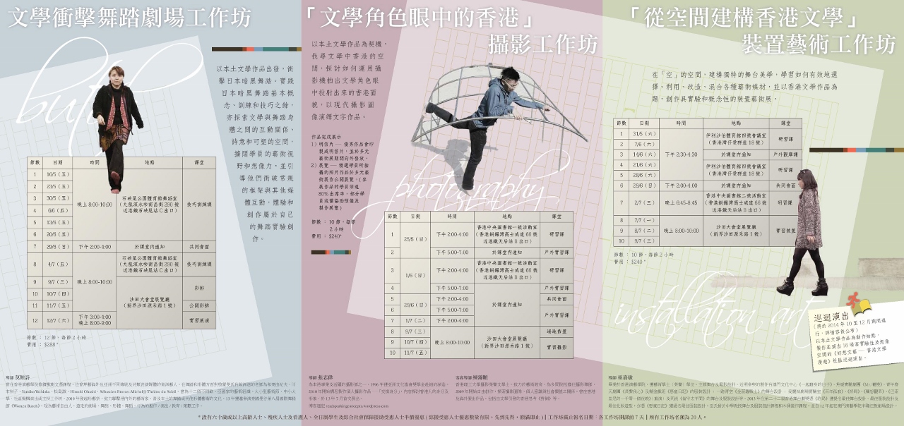 以本土文學作品出發,衝擊日本暗黑舞踏。實踐日本暗黑舞踏基本概念、訓練和技巧之餘,亦探索文學與舞踏身體之間的互動關係、詩意和可塑的空間,擴闊學員的藝術視野和想像力,並引導他們衝破常規的框架與其他媒體互動,體驗和創作於自己的舞踏實驗創作。