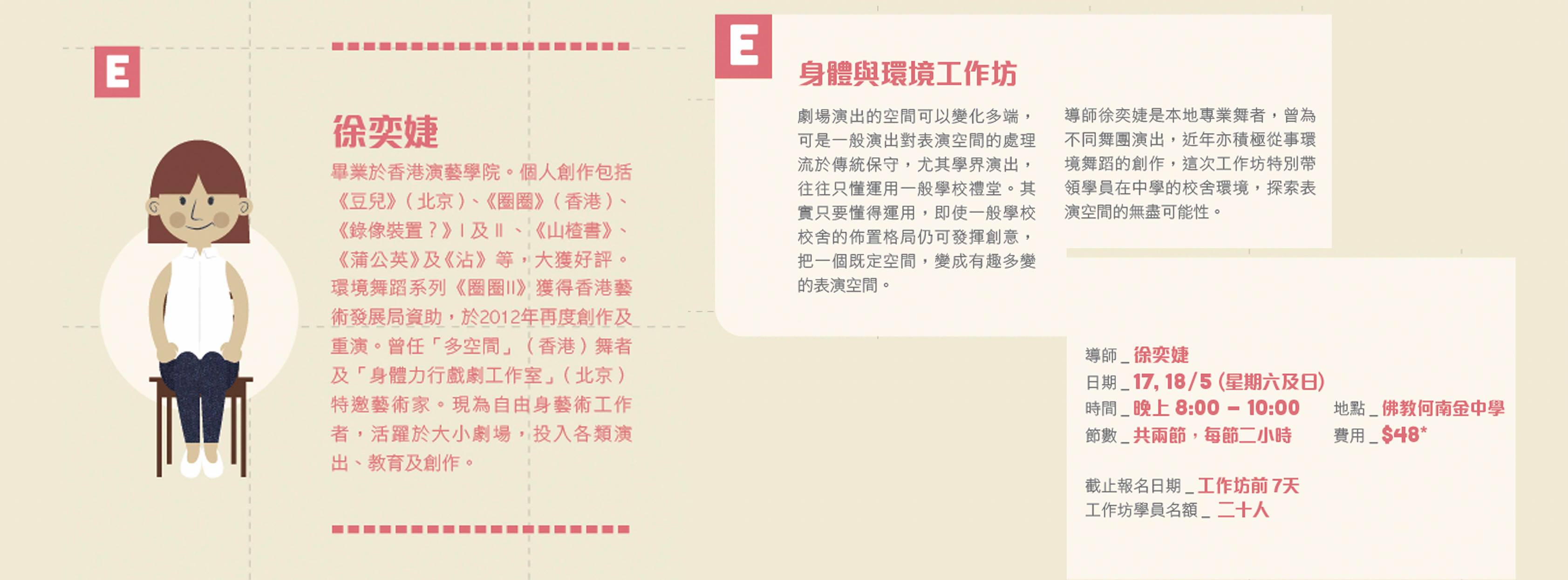 導師徐奕婕是本地專業舞者,曾為不同舞團演出,近年亦積極從事環境舞蹈的創作,這次工作坊特別帶領學員在中學的校舍環境,探索不同表演空間的無盡可能性。
