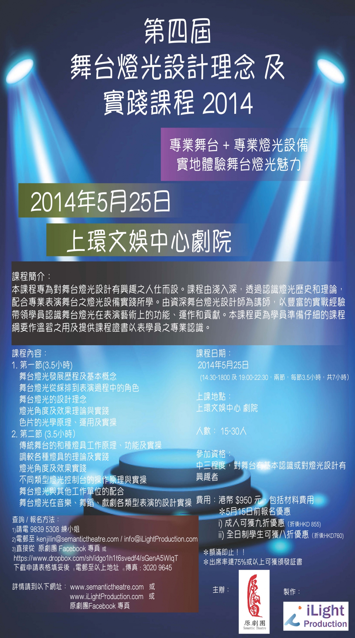本課程專為對舞台燈光設計有興趣之人仕而設。課程由淺入深,透過認識燈光歷史和理論,配合專業表演舞台之燈光設備實踐所學。由資深舞台燈光設計師為講師,以豐富的實戰經驗帶領學員認識舞台燈光在表演藝術上的功能、運作和貢獻。本課程更為學員準備仔細的課程綱要作溫習之用及提供課程證書以表學員之專業認識。