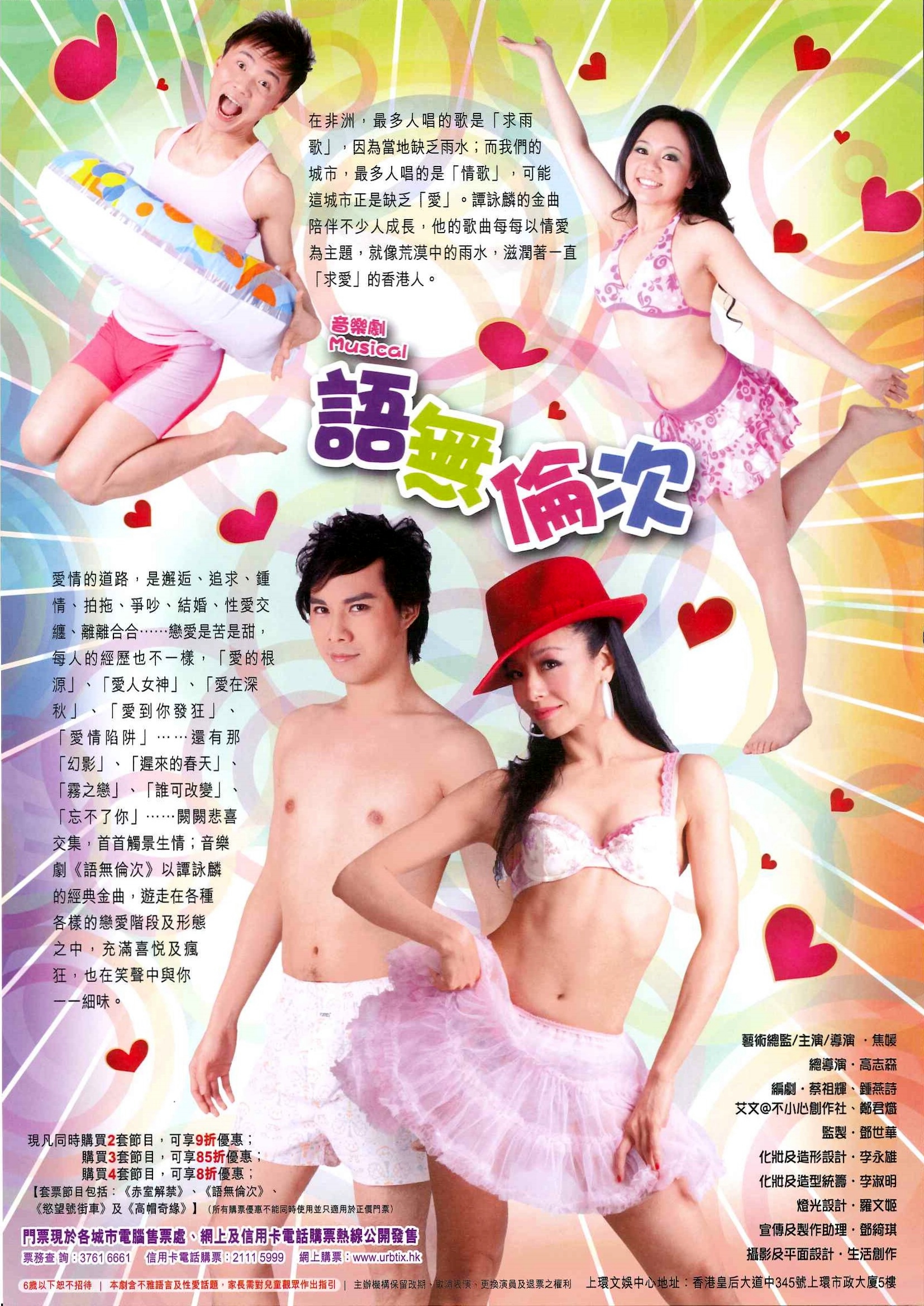 在非洲,最多人唱的歌是「求雨歌」,因為當地缺乏雨水;而我們的城市,最多人唱的是「情歌」,可能這城市正是缺乏「愛」。譚詠麟的金曲陪伴不少人成長,他的歌曲每每以情愛為主題,就像荒漠中的雨水,滋潤著一直「求愛」的香港人。 愛情的道路,是邂逅、追求、鍾情、拍拖、爭吵、結婚、性愛交纏、離離合合……。戀愛是苦是甜,每人的經歷也不一樣,「愛的根源」、「愛人女神」、「愛在深秋」、「愛到你發狂」、「愛情陷阱」……還有那「幻影」、「遲來的春天」、「霧之戀」、「誰可改變」、「忘不了你」……闕闕悲喜交集,首首觸景生情;音樂劇《語無倫次》以譚詠麟的經典金曲,遊走在各種各樣的戀愛階段及形態之中,充滿喜悅及瘋狂,也在笑聲中與你一一細味。