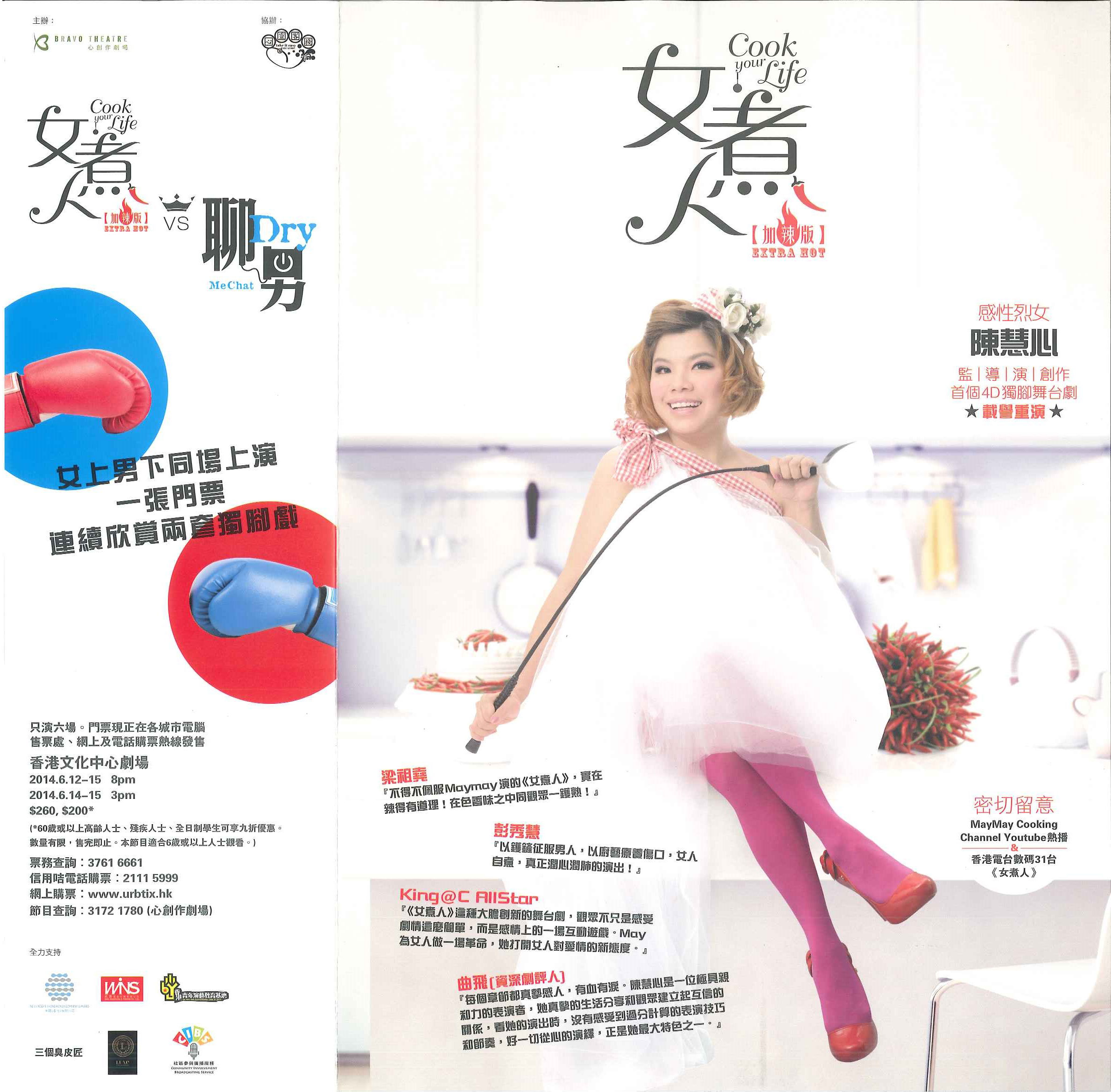 心創作劇場藝術總監陳慧心May Chan, 多齣深受歡迎的舞台劇女主角,2011年憑《胖侶》Helen一角榮獲提名第二十屆香港舞台劇獎最佳女主角(喜/鬧劇)。May是一位演而優則煮的舞台劇演員,平日會透過Youtube, 微博和Facebook和戲迷朋友分享煮食心得,更自資拍攝烹飪短片,於網絡上分享煮食的方法和樂趣(MayMay Cooking Channel),2014年1月將舞台幻化成顯廚藝的地方,創作4D獨腳戲《女煮人》於灣仔藝術中心麥高利小劇場演出8場,贏盡口碑,好評如潮。 今次重鎚出擊將《女煮人》加辣再加辣,除了是一齣睇得見、聞得出、食得到、感覺辣的舞台劇外,更會在這個充斥著無數飲食節目的「好好味」後還是「好好味」年代,教你重新細味食物中的感情。每一道菜也應該是一個經歷,吃過苦嚐過甜後,才會成長。