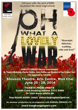 Hong Kong Players is delighted to be presenting this legendary musical, which took the West end by storm in 1963, and which was the basis for the 1969 Richard Attenborough film. Through the use of archival news footage & historical photographs, dialogue taken from first-person accounts and WWI-era songs, Oh, What a Lovely War satirises the madness of war, blending humour and pathos to create an unforgettable night of theatre. This production commemorates the centenary of the outbreak of World War One.