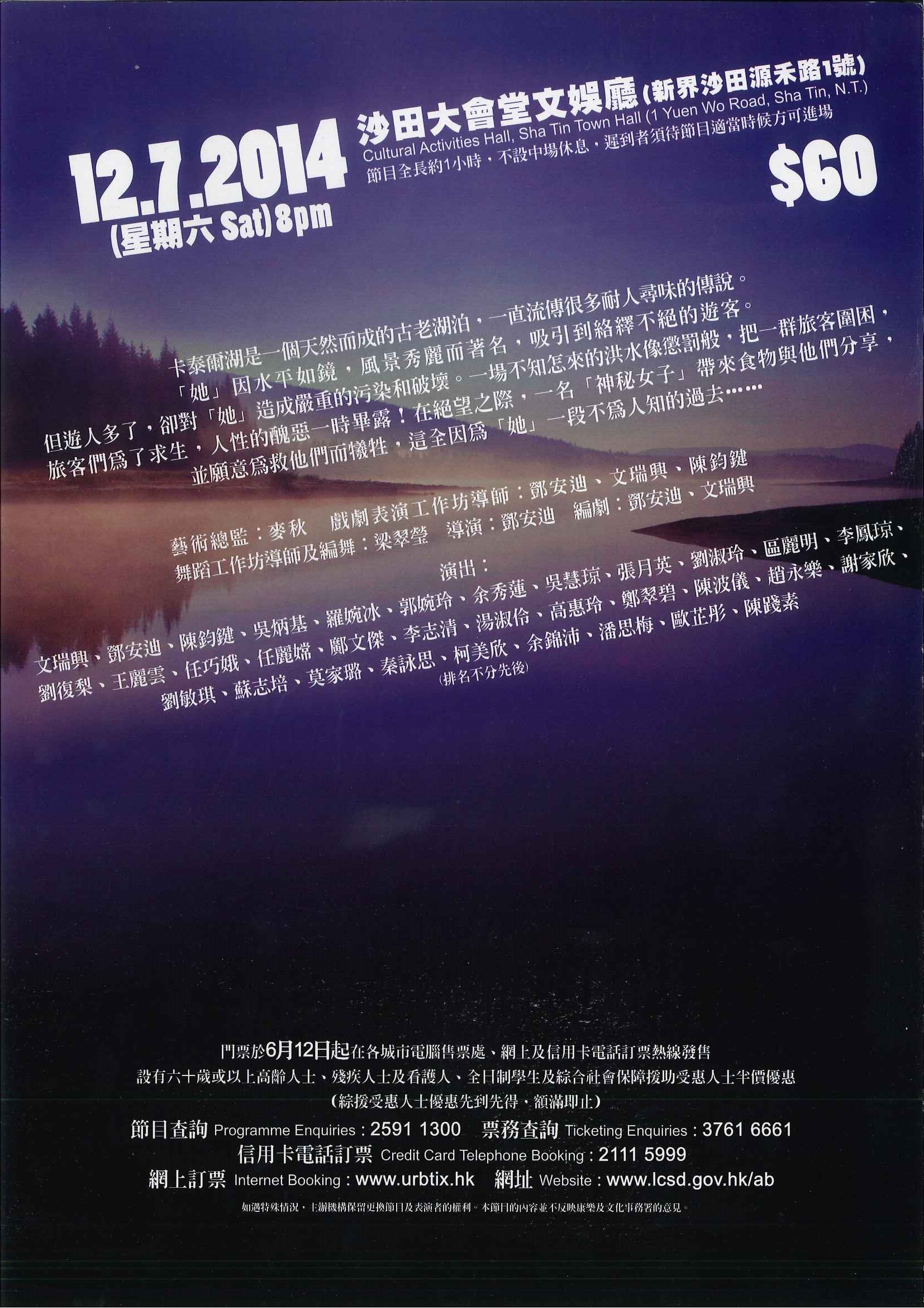 — 靈感源自水精靈溫蒂妮的傳說卡泰爾湖是一個天然而成的古老湖泊,一直流傳很多耐人尋味的傳說。「她」因水平如鏡,風景秀麗而著名,吸引到絡繹不絕的遊客。但遊人多了,卻對「她」造成嚴重的污染和破壞。一場不知怎來的洪水像懲罰般,把一群旅客圍困,旅客們為了求生,人性的醜惡一時畢露!在絕望之際,一名「神秘女子」帶來食物與他們分享,並願意為救他們而犧牲,這全因為「她」一段不為人知的過去……