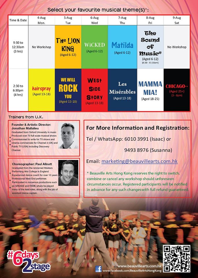 France based musical theatre summer camps operator BEAUVILLE ARTS is in Hong Kong this Summer and have put together a series of "Perfect 10 Musical Theatre Workshops" for local participants to experience the Beauville style of teaching. Just choose and join one (or many) of their below workshops.