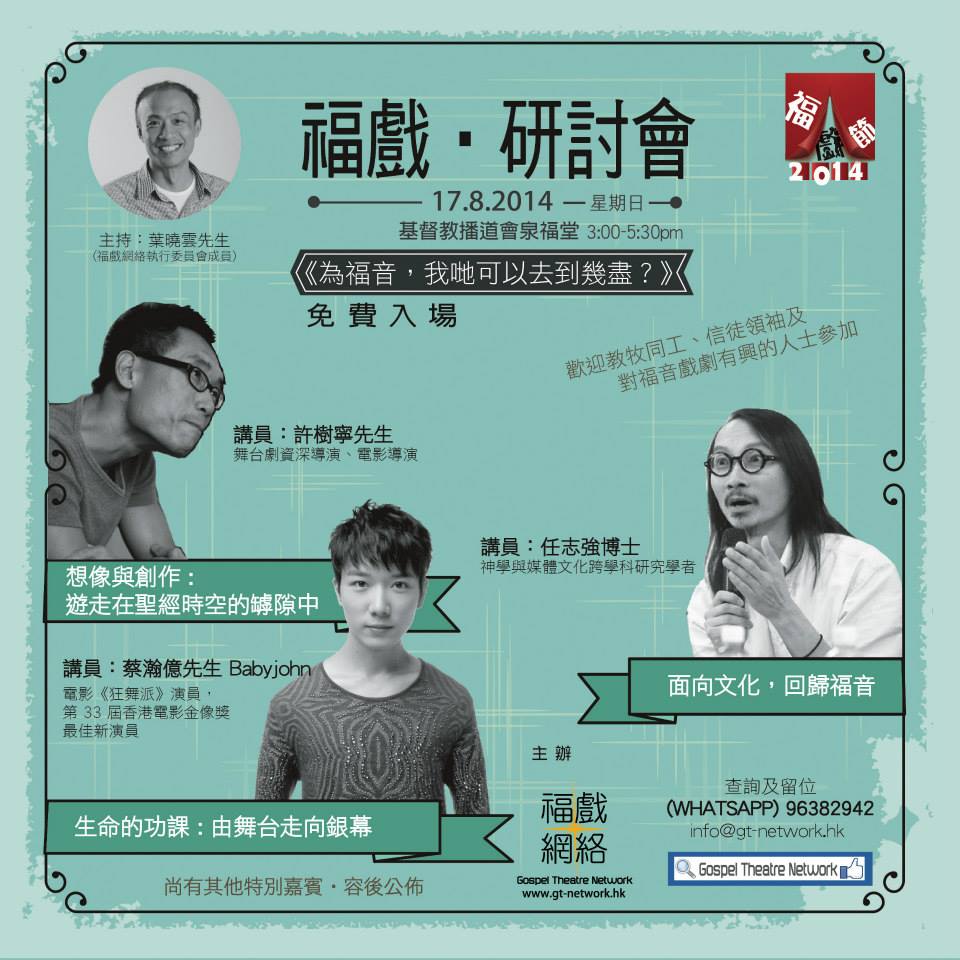 對象:歡迎教牧同工、信徒領袖及對福音戲劇有興的人士參加分題(1) 面向文化,回歸福音講員:任志強博士(神學與媒體文化跨學科研究學者) 分題(2) 想像與創作: 遊走在聖經時空的罅隙中講員:許樹寧先生(舞台劇資深導演、電影導演)分題(3) 生命的功課: 由舞台走向銀幕講員:蔡瀚億先生 ( Babyjohn )(電影《狂舞派》演員,第 33 屆香港電影金像獎最佳新演員)