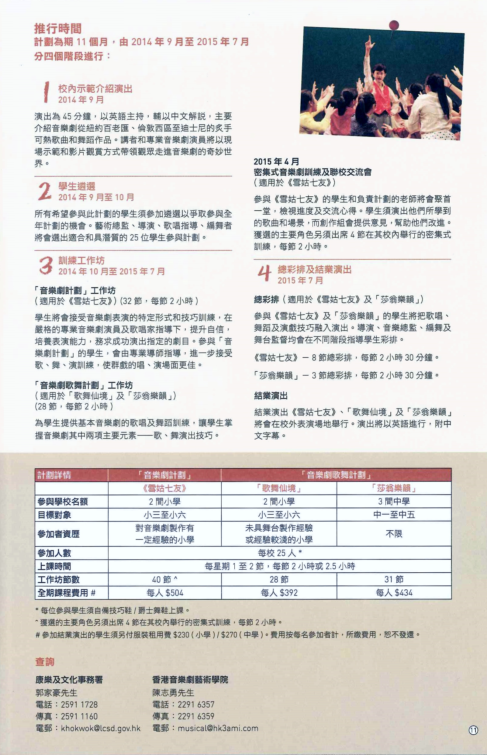 課程包括欣賞演出、音樂劇歌、舞、演訓練和演出等