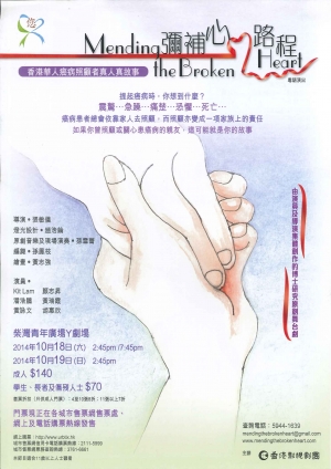 《彌補心路程》是一項由演只及導演集體創作的博士研原創舞台劇,改編自香港華人社會內癌病照顧者的親身經歷,由研究的參與者 - 即癌病照顧者 - 親自演出,讓觀眾見證真實的癌病照顧經過,聆聽他們的喜怒哀樂,分享他們的希望、喜悅、愛、學習及忠告。本製作是一項研究報告,為香港社會提供一個互相交流及分享的公開平台,討論一個難以開口的話題:疾病、癌症、照顧及死亡,演出完畢後歡迎觀眾分享自己的故事。