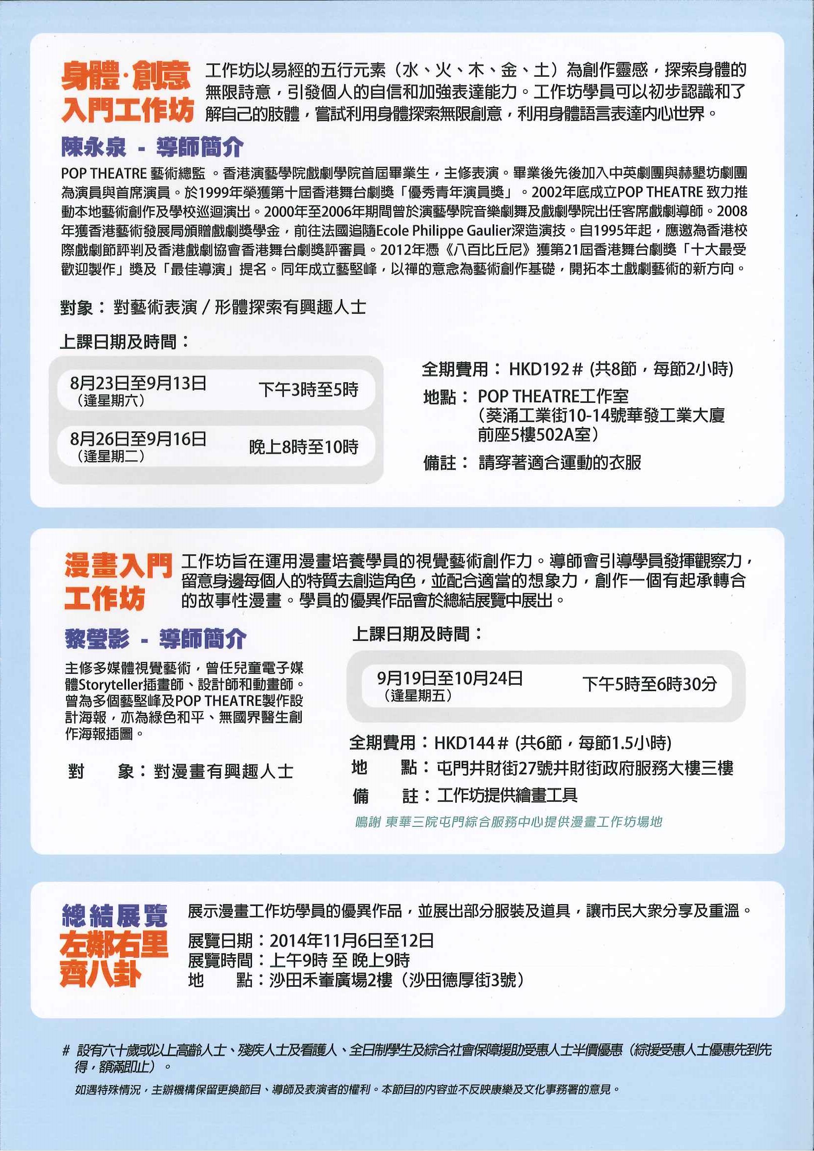 計劃介紹計劃藉著不同的活動,在社區推廣劇藝,提升社群對藝術表演的興趣和欣賞能力。務求令觀眾明白,即使生活在石屎森林,中華文化仍與我們息息相關。以《易經》為今次計劃的主軸,如八卦的「乾、坤、艮、兌、震、巽、坎、離」及由八卦變化而成的六十四卦等。日常生活中,我們會嘲諷他人「諸事八卦」、「唔係卦」或「又變卦」,卻未必了解古人的智慧。 總結展覽展示學員於漫畫工作坊的作品,部分服裝及道具,讓市民大眾分享、重溫。