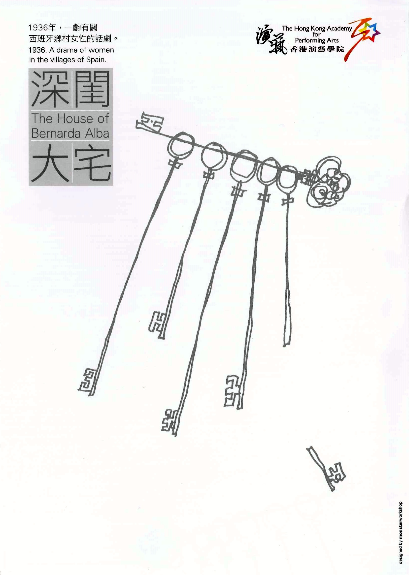 1936年,一齣有關西班牙鄉村女性的話劇。此劇由著名西班牙詩人洛爾迦編撰,故事講述一名寡婦Bernarda Alba於丈夫去世後,在家中實行「鎖國政策」,全家上下都要與她守喪多年。唯一似乎可以逃離厄運的是大女兒Angustias。她已許配了同村最富有、最有魅力的單身男士Pepe el Romano。五名女兒不斷膨脹的慾望,面對著重門深鎖的權力圍牆;慾望與權力的對抗,慾望爆破,把各人推至崩潰的沸點;明爭暗鬥,最終引致悲劇。