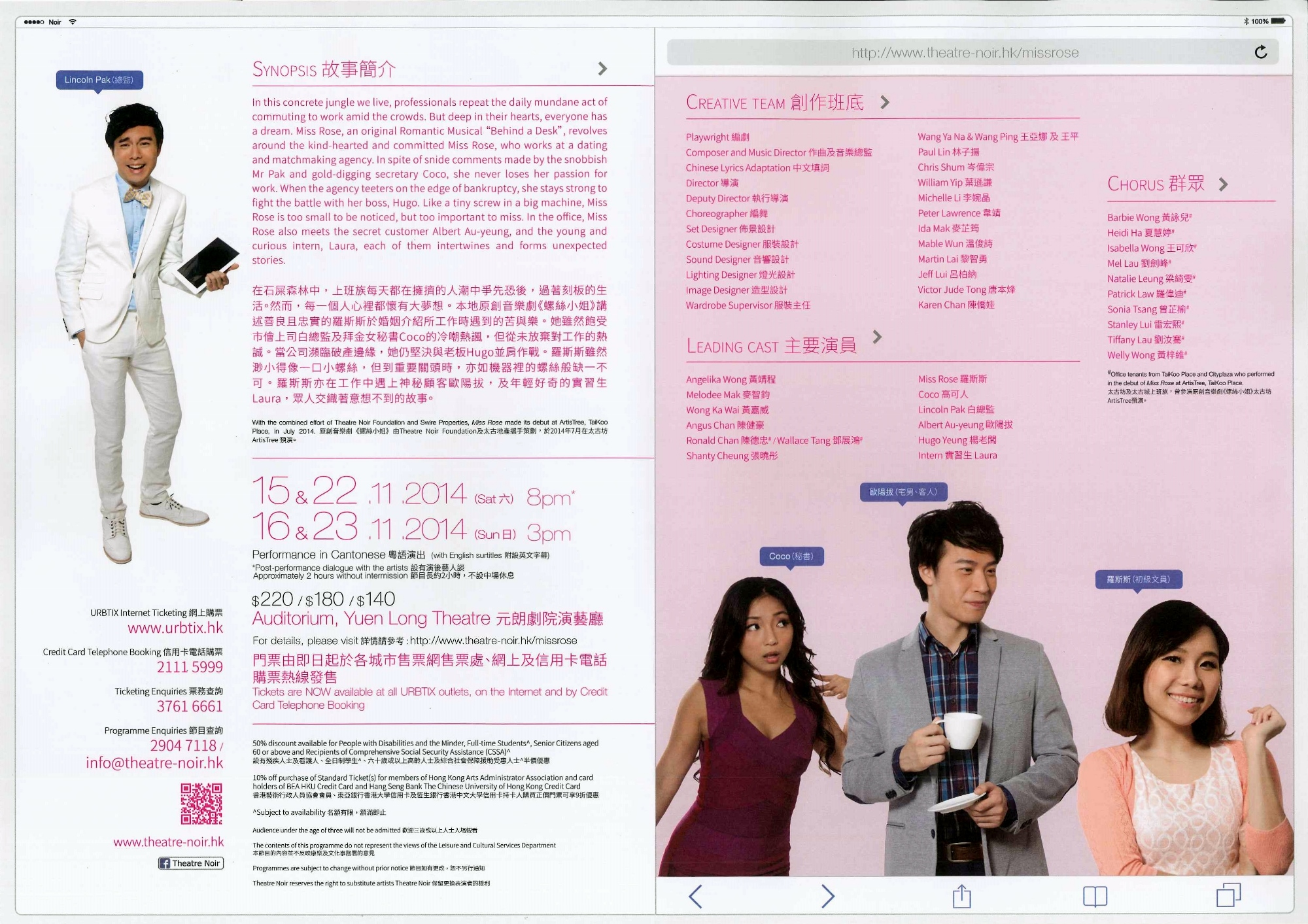 在石屎森林中,上班族每天都在擁擠的人潮中爭先恐後,過著刻板的生活。然而,每一個人心裡都懷有大夢想。本地原創音樂劇《螺絲小姐》講述善良且忠實的羅斯斯於婚姻介紹所工作時遇到的苦與樂。她雖然飽受市儈上司白總監及拜金女秘書Coco的冷嘲熱諷,但從未放棄對工作的熱誠。當公司瀕臨破產邊緣,她仍堅決與老板Hugo並肩作戰。羅斯斯雖然渺小得像一口小螺絲,但到重要關頭時,亦如機器裡的螺絲般缺一不可。羅斯斯亦在工作中遇上神秘顧客歐陽拔,及年輕好奇的實習生Laura,眾人交織著意想不到的故事。