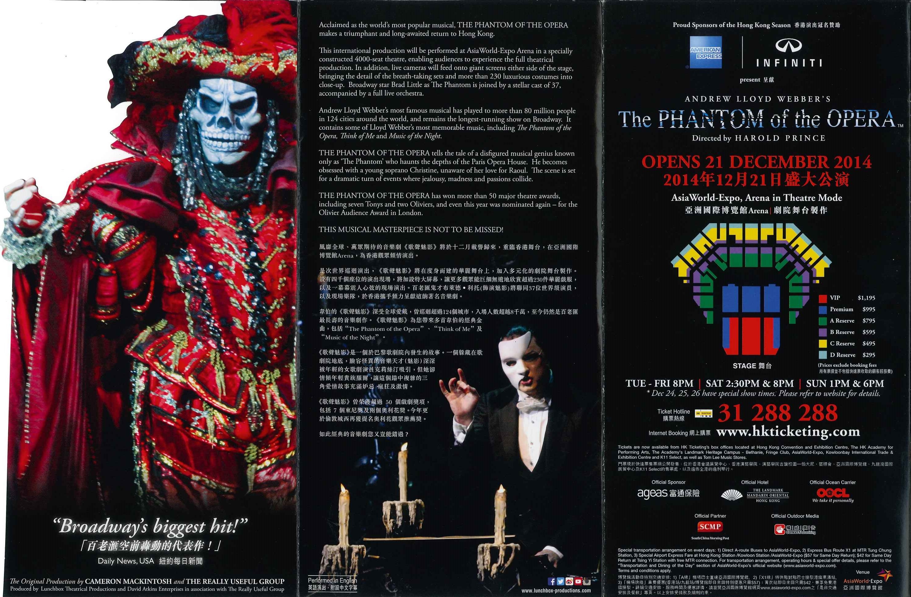 巡迴超過124個城市,入場人數突破8千萬,韋伯最成功且深受全球愛戴的《歌聲魅影》,於2014年12月載譽來港,在亞洲博覧館Arena館,為香港觀眾傾力呈獻百老滙最長壽的著名音樂劇。