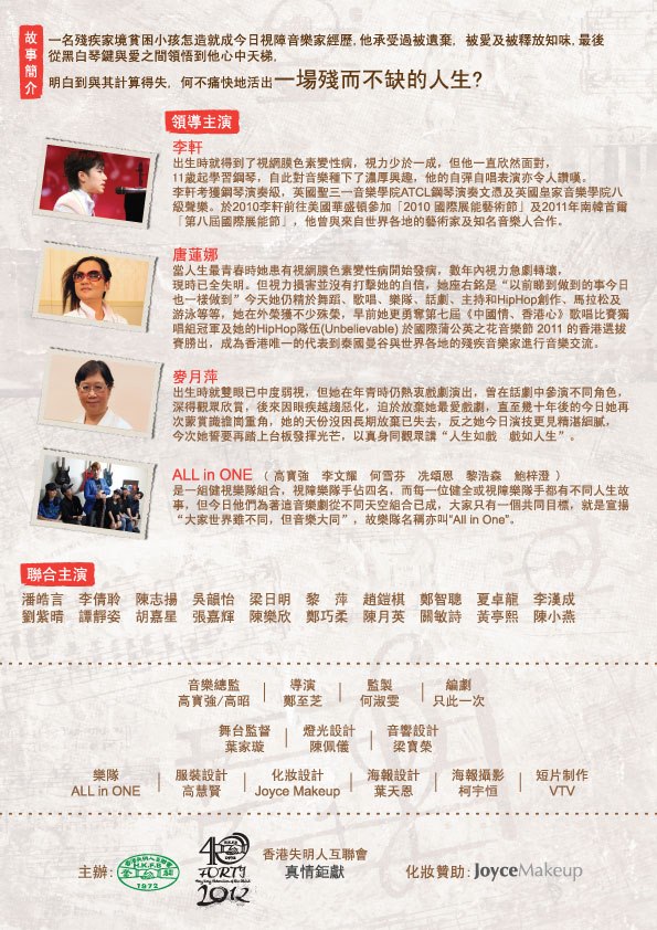 此劇共有十多名視障人士作參與幕前演出,取材自七十年代不少視障人士的共同經歷,男主角八歲時因高燒失去視力,但因家貧及父母無力照顧,主角被送進孤兒院,幸熱愛音樂的主角在孤兒院院長護理及悉心指導下,透過音樂找到人生的意義,終成為出色的音樂家.