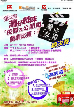 演出隊伍:仲劇團《請別帶走燈光》家計會婦女會社區劇團《家有嬌妻》進階班同學會《喝橙汁的男人》校際組:聖公會鄧肇堅中學 Made in Wan Chai嘉諾撒書院《揭開頭巾》玫瑰崗學校(中學部)《歲月留情》