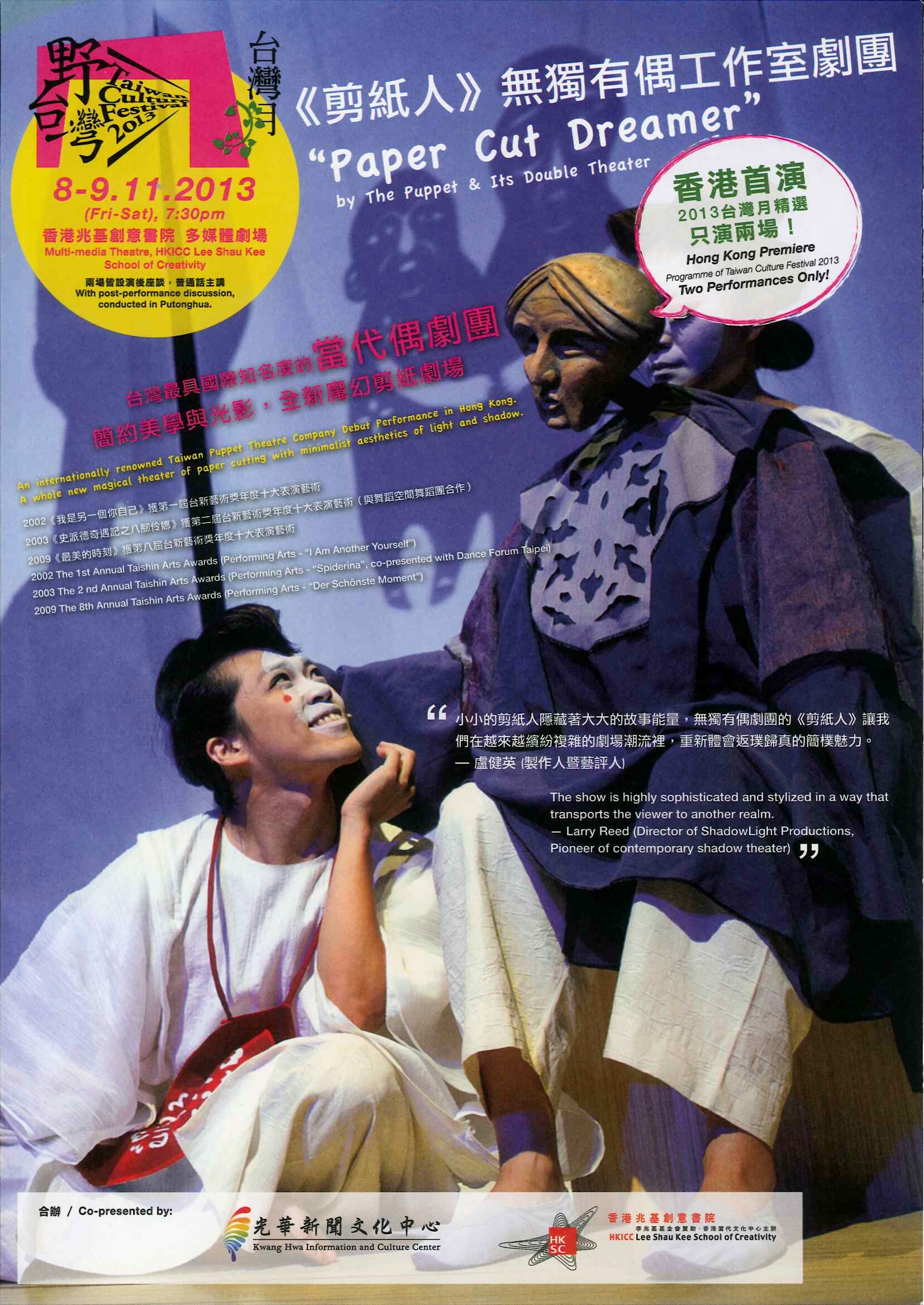 說故事的人為歷史和想像賦予了聲音,也為聽故事的人打造集體記憶、喚回力量。無獨有偶延續多年來對戲偶操控美學的多面向探索與嘗試,《剪紙人》藉由人、偶共台形式的微妙關係,及人和偶、偶與偶之間互動所產生的化學變化,讓角色恣意在現實世界與神話世界之間遊走交替。從一個中國古老的故事開始發想,結合杖頭偶戲、民間剪紙藝術、奇幻光影手法,並注入了現代精神與關懷議題,為遠久的故事開拓新的生命力,帶來嶄新的偶戲演繹形式與展現。觀眾進入真實與虛幻交錯的隱晦中,探索中國傳統民俗故事的變形與延伸,形塑新穎的東方式魔幻劇場。