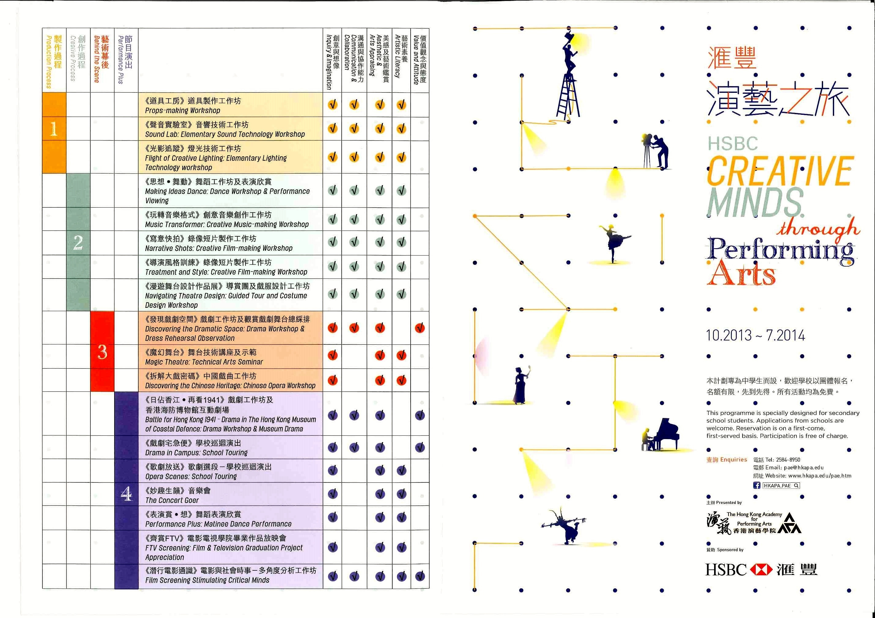由2013年10月至2014年7月舉行的「滙豐演藝之旅」,讓中學生參與舞蹈、戲劇、音樂、電影、舞台藝術製作和戲曲的表演藝術活動。它們分成四大範疇:(一) 製作過程、 (二) 創作過程、 (三) 藝術幕後,及 (四) 節目演出,讓學生體驗演藝魅力,發展以下各項潛能:
