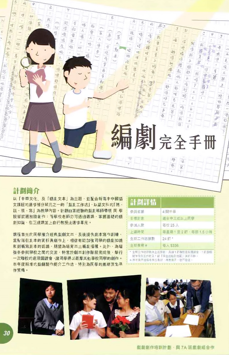 在四個範疇 (中國古典文學、新文學、本地文學及外國翻譯名著) 裡,由同學選定戲劇體裁作為創作的藍本,同學可分組完成劇本創作的其中一部分,最後組合成一個短劇作公開演出。