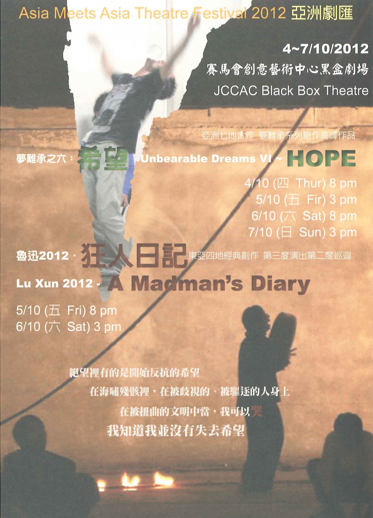 午夜夢迴,總有些夢難以忘懷,它比現實更可怕,是活在夢裡比活在現實更難?夢總是脫離現實,幹想幹的事;當肢體意識離場,腦袋的想像卻在沸騰,想像在飛翔、在墮下、在銷魂、在膨脹、在收縮、在狂歡、在超越…現實的不可,夢境沒有不可;時間、空間、形態,在夢裡總是不規律,身體在這裡只有服從想像;難以承受的圖像是被切割得支離破碎,或有些碎片能跟現實引證,是有跡可尋,是個人及社會的希望圖像。《夢難承之六︰希望》是香港與亞洲劇場人集體潛意識指導身體的創作…