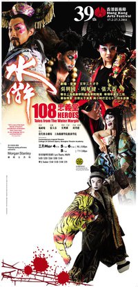 台灣當代傳奇劇場藝術總監吳興國以跨媒介跨藝術形式聞名中外,這次與香港藝術節及上海戲劇學院戲曲學院精英攜手,借台灣文學才子張大春將梁山豪傑變成「潮」中好漢,加上周華健全新樂曲及精采戲曲音樂,將元末明初的施耐庵原著覆上當代崩裂氛圍,形成最搖滾激烈的好漢出奔故事。2007年《水滸108》第一炮,掀起震撼迴響。2011年第二擊將更上層樓。