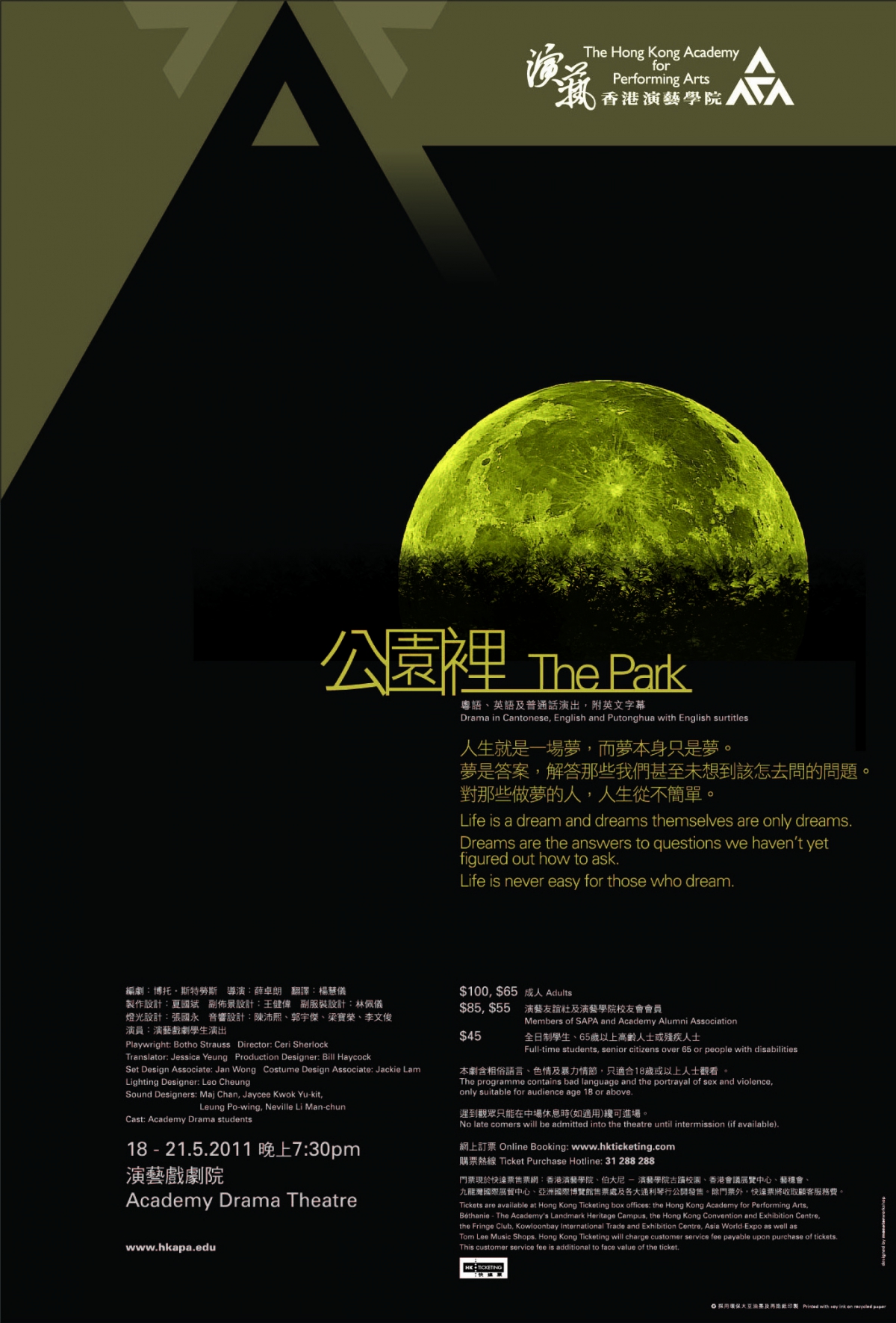 人生就是一場夢,而夢本身只是夢。 夢是答案,解答那些我們甚至未想到該怎去問的問題。 對那些做夢的人,人生從不簡單。 《公園裡》是由德國偉大編劇布圖‧史特勞斯所寫的一齣五幕劇,以現代方式探討莎士比亞《仲夏夜之夢》裡的主題與角色。它同時是黑暗版的莎劇,「夢」在這裡演變成一個無法逃離的「噩夢」。故事圍繞兩位希望重整地球上愛與和諧之力的角色 ﹣奧伯倫與鐵坦尼亞。他們造訪了青年人與流浪漢的棲息地 ﹣城中公園。但是,由於他們與人類交往且漸融於現實世界,他們的「魔力」開始失效。漸漸,他們變回凡人,墮入人倫的迷宮。如同莎士比亞的《仲夏夜之夢》,故事在玩著月亮的循環交替、一個「情人變成瘋子」的虛構時空。 布圖‧史特勞斯的劇作雖然設定於現代,但仍保留著魔幻與神話的元素,像角色奧伯倫 (精靈之王)、鐵坦尼亞 (王后、月亮女神) 與塞浦路斯 (混合了妖精柏克與迪達勒斯 [伊卡魯斯之父、拉比林特斯迷宮的創造者] 的存在)。劇作家提醒了我們兩劇中皆隱藏了古希臘神話裡有關牛頭人身怪與帕西法厄的一段故事。帕西法厄是一名受詛咒而與一隻公牛結合的悲劇女性,而這段故事被莎士比亞轉化成鐵坦尼亞愛上一個戴著驢頭的傻人喜劇。但在《公園裡》,這段神話被沿用,正好配合這後現代的劇作,讓歷史與記憶在複雜而多樣的人類行為中被解剖。