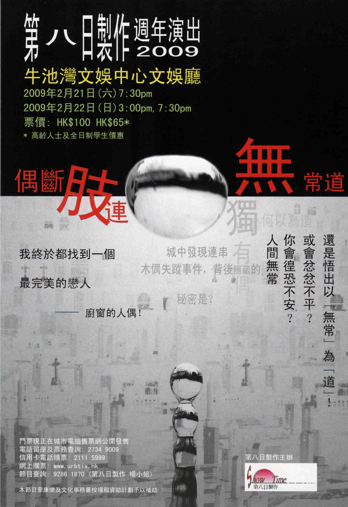 劇目一:三人蜜近《偶斷肢連》Ricky在尋找最完美的戀人,竟然是時裝店廚窗內的人偶,甜美的笑容,完美的身軀,段段夢樣、激情、慾望、迷離…在尋尋覓覓,愛是什麼?是犧牲、捨身、寬恕、無條件的愛?那裡會有? -廚窗的人偶 劇目二:第八日製作《無常道》人間無常,你會徨恐不安?或會忿忿不平?還是悟出以無常為道!