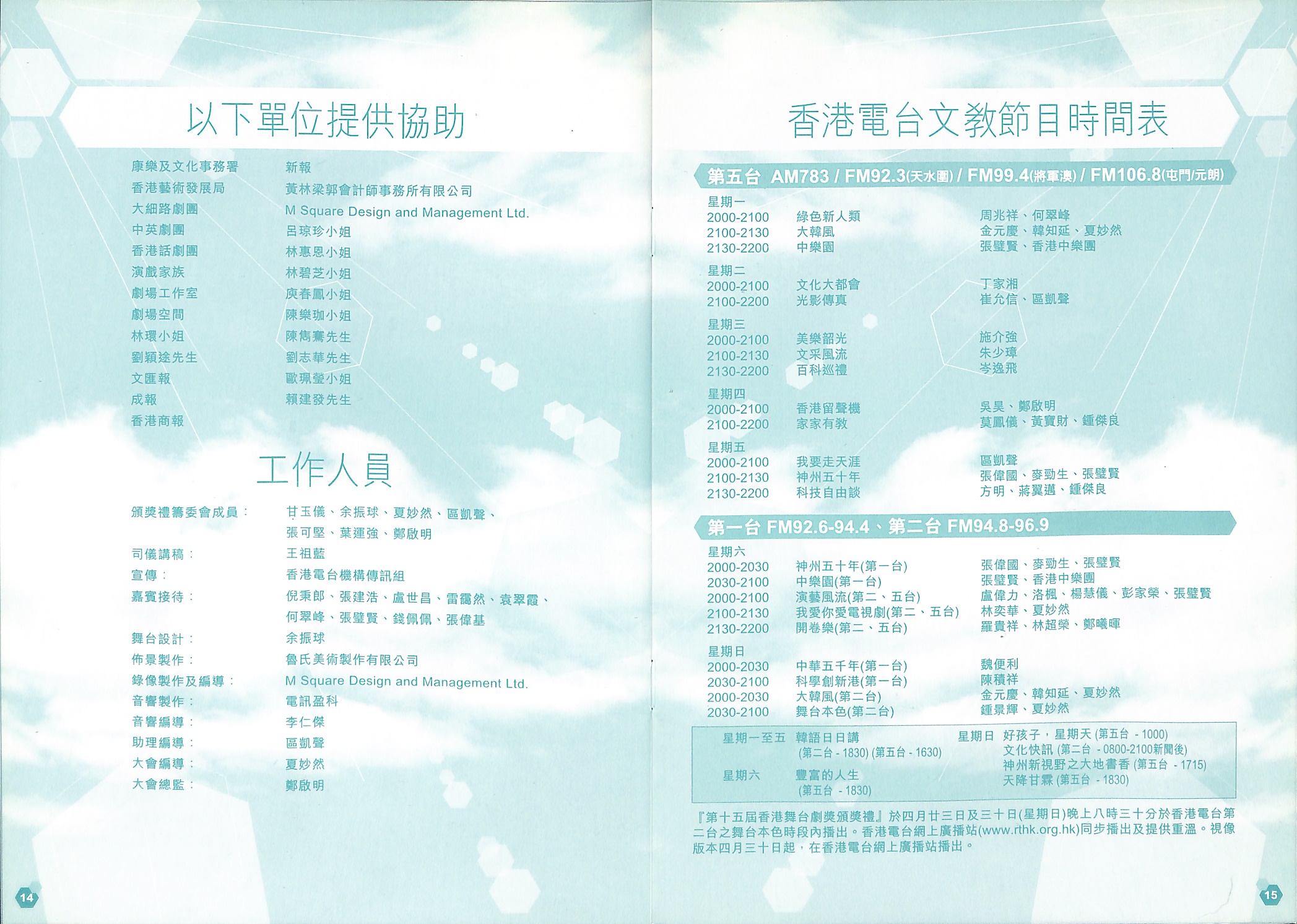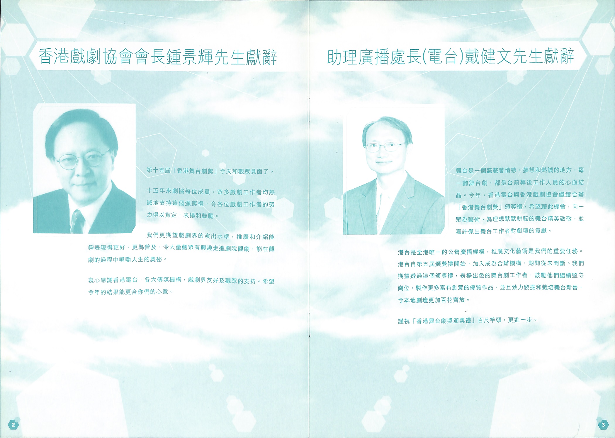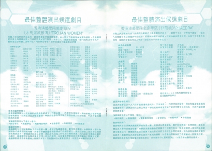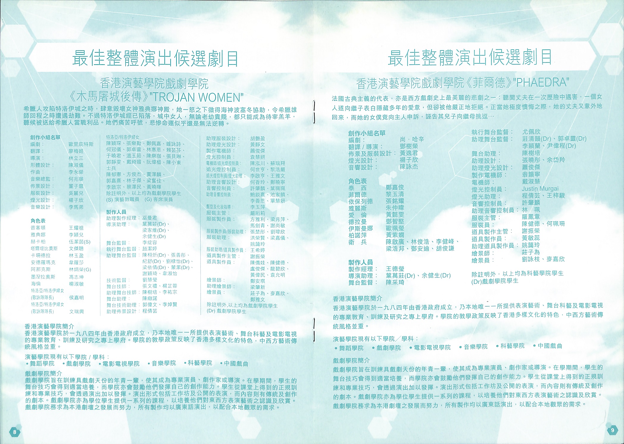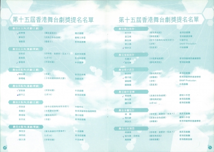 最佳導演(悲劇/正劇)鄧樹榮《菲爾德》香港演藝學院戲劇學院 最佳導演(喜劇/鬧劇)黃龍斌, 林澤群《二人前?2人後》異人實驗劇場 最佳劇本莊梅岩《法吻》SNAP Production 最佳男主角(悲劇/正劇)辛偉強《生殺之權》香港話劇團 最佳男主角(喜劇/鬧劇)林澤群《二人前?2人後》異人實驗劇場 最佳女主角(悲劇/正劇)梁翠珊.《彌敦道兩岸》灣仔劇團 最佳女主角(喜劇/鬧劇)廖雅琪《芳草校園》中英劇團 最佳男配角(喜劇/鬧劇)凌智豪《芳草校園》中英劇團 最佳女配角(悲劇/正劇)邵美君《你今日拯救咗地球未呀?》W創作社 最佳女配角(喜劇/鬧劇)陳桂芬《事先張揚的求愛事件》中英劇團