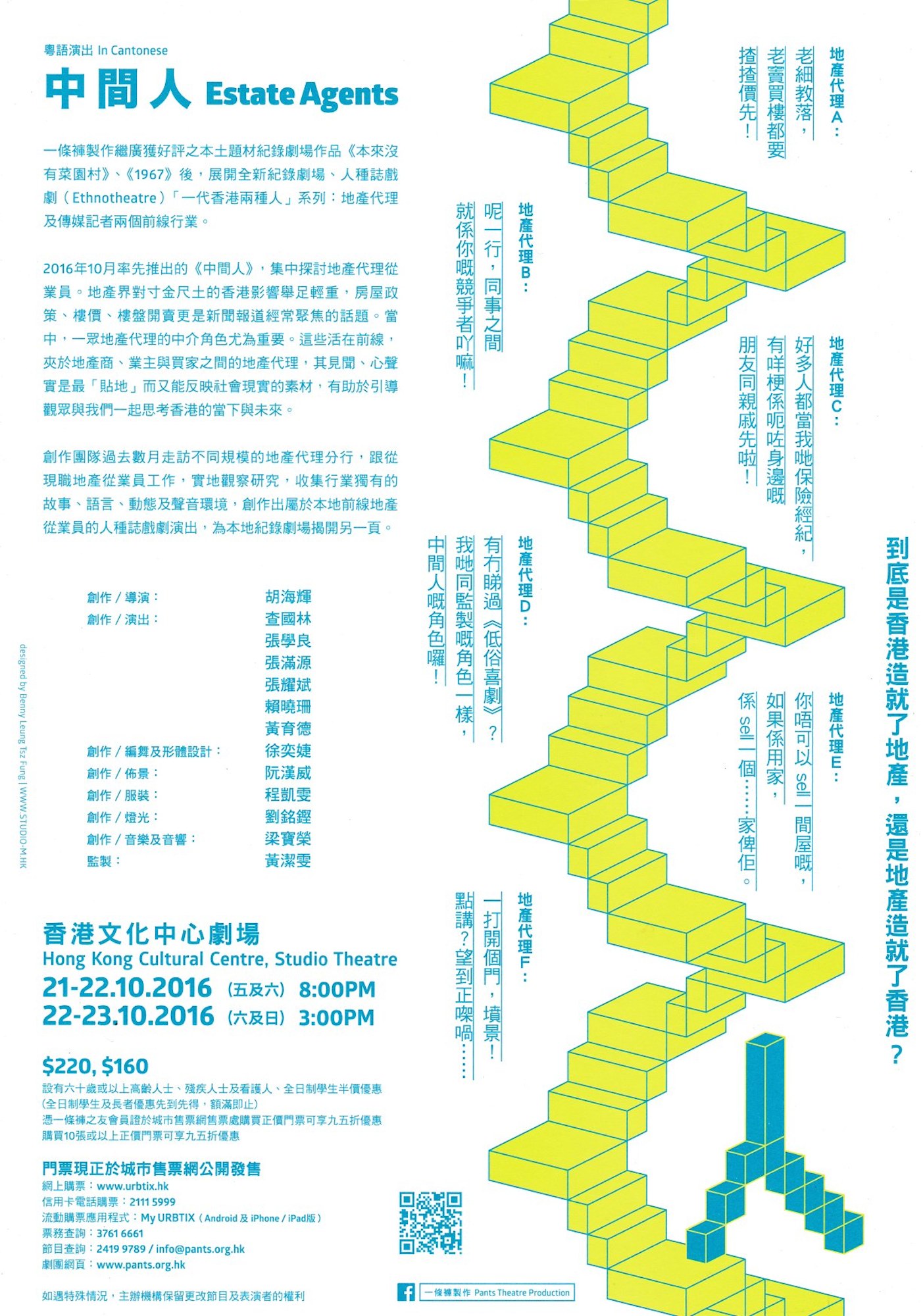 一條褲製作繼廣獲好評之本土題材紀錄劇場作品《本來沒有菜園村》、《1967》後,展開全新紀錄劇場、人種誌戲劇(Ethnotheatre)「一代香港兩種人」系列:地產代理及傳媒記者兩個前線行業。