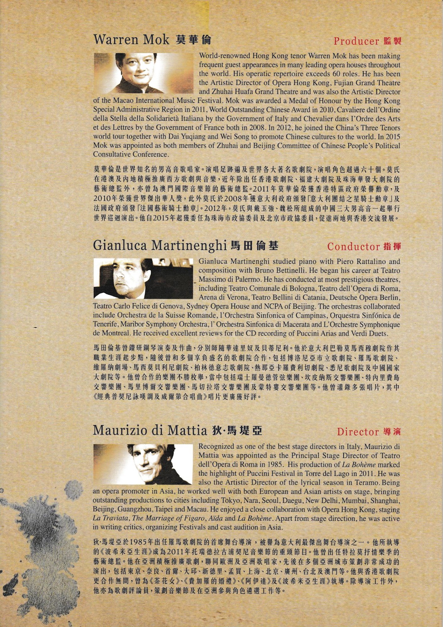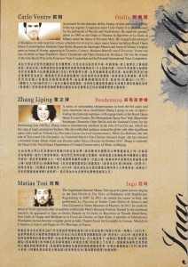 是次製作邀來兩個國際級演員陣容。烏拉圭男高音雲特飾演奧賽羅,其美麗的音色享譽樂壇,尤其在高音區從容不迫,水銀瀉地,加上他舞台上精湛的演技,收放自如,演繹浦契尼及威爾第的英雄角色栩栩如生,令人拍案叫絕。另一位同樣演唱奧賽羅的美國男高音泰納自1992年作首個專業演出,在多個國際聞名的歌劇院均獲得熱烈掌聲及評價。飾演蒂斯蒂夢娜的中國著名女高音張立萍,曾與多個國際級歌劇院合作,為首位簽約環球音樂的華人古典歌唱家。塞佩是當今意大利歌劇界備受矚目的年青女高音之一,於2015年榮獲歌劇奧斯卡的新世代女高音殊榮,同樣會演唱蒂斯蒂夢娜一角。 本劇最大的奸角分別由阿根廷年青男中音托斯及中國著名男中音孫礫飾演。2007年出道的托斯,於2013年演唱《奧賽羅》亞哥一角一鳴驚人。2008年,孫氏主演的歌劇《霸王別姬》在美國六地巡演,獲得高度評價,更藉此劇摘得「文華表演獎」。被譽為亞洲最頂尖的古典管弦樂團之一,香港管弦樂團將攜手與香港歌劇院合唱團及香港歌劇院兒童合唱團,在意籍指揮大師馬田倫基的捧下演出。