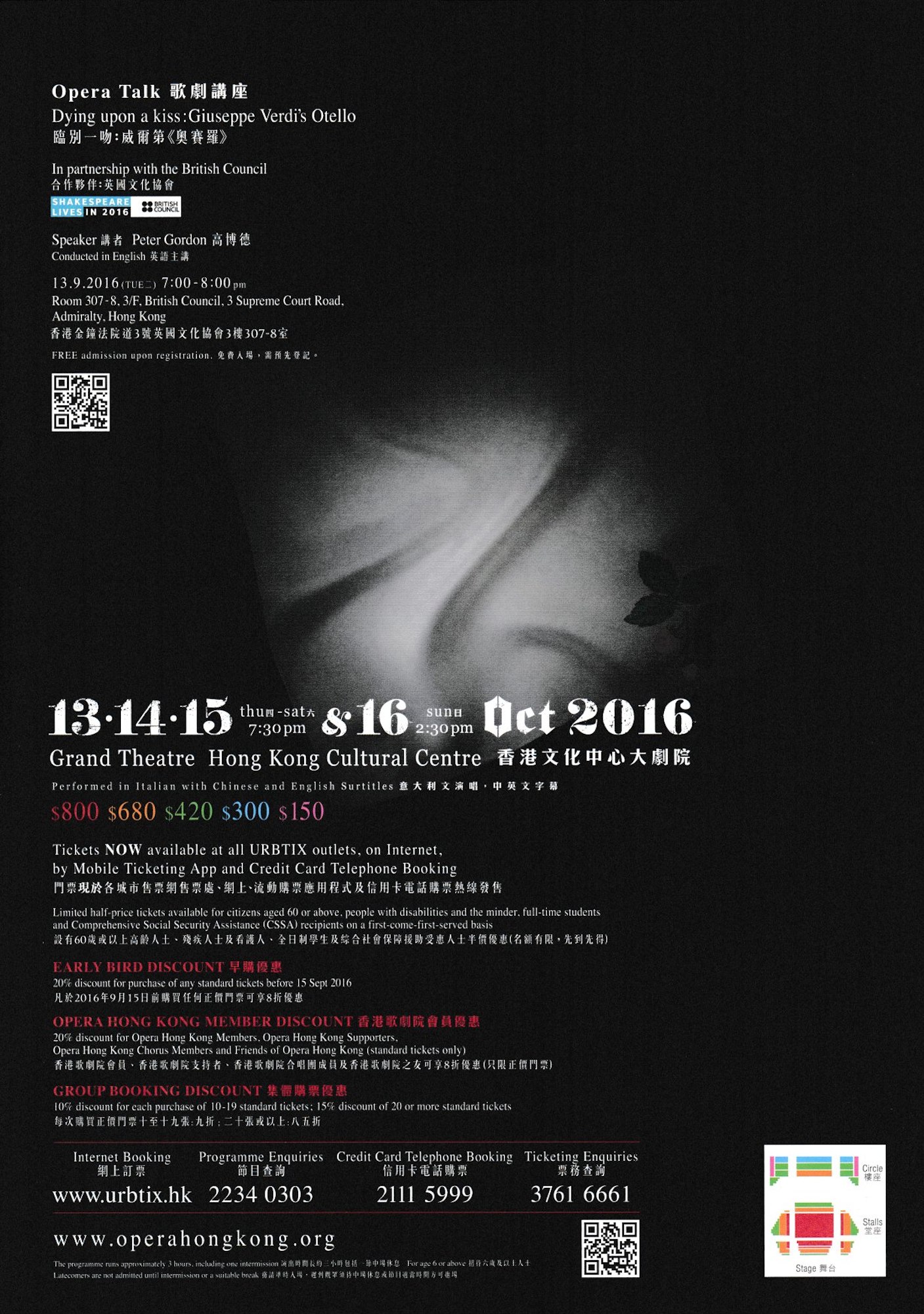 為紀念莎士比亞逝世400週年,香港歌劇院將製作其四大悲劇之一的《奧賽羅》。歌劇將於10月13至16日假香港文化中心大劇院公演,邀來國際頂尖的歌唱家,聯同香港管弦樂團,在意籍指揮大師馬田倫基的領導下,呈獻狄 ‧ 馬堤亞的全新製作。
