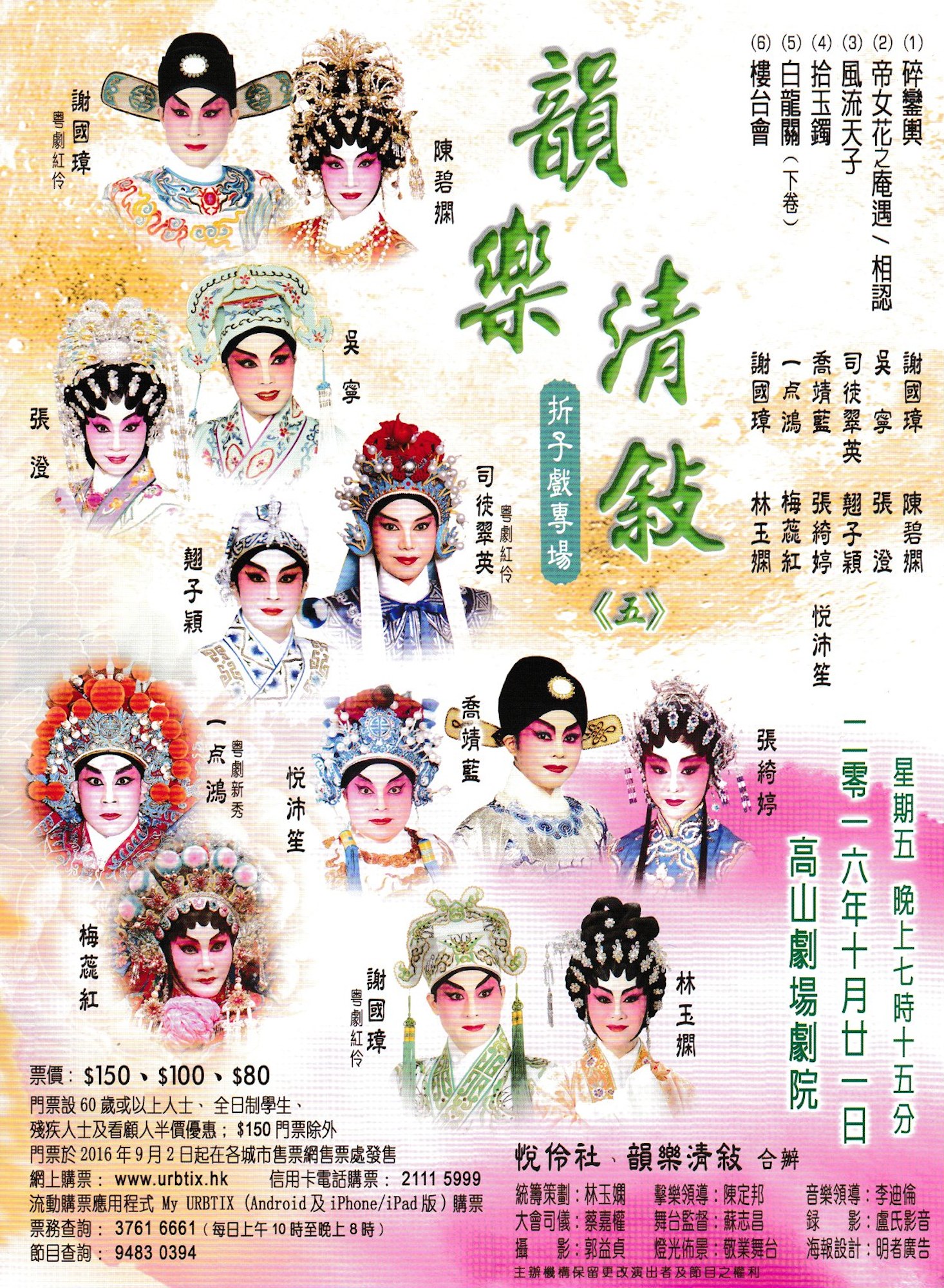 因颱風關係,由悅伶社及韻樂清敍合辦原定於2016年10月21日晚上7時15分假高山劇場劇院舉行之《韻樂清聚折子戲專場(五)》現告取消。節目將會延期至2017年1月1日(星期日)晚上7時15分舉行。觀眾請保留完整門票,以便當日入場。 如有查詢,請致電 9483-0394 聯絡主辦機構。