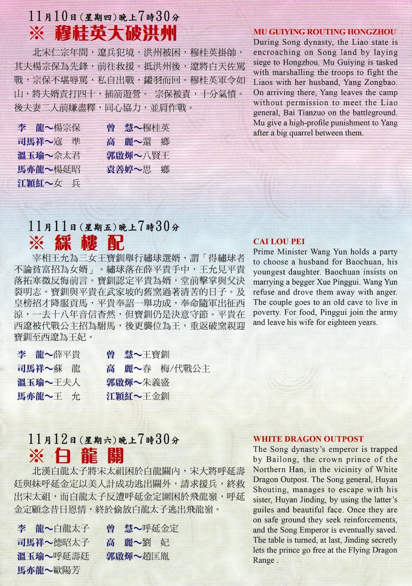 北宋仁宗年間,遼兵犯境,洪州被困,穆桂英掛帥, 其夫楊宗保為先鋒,前往救援。抵洪州後,遼將白天佐罵戰,宗保不堪辱罵,私自出戰,鐵羽而回。穆桂英軍令如山,將夫婿責打四十,插箭遊營。宗保被責,十分氣憤。後夫妻二人前嫌蓋程澤・同心協力,並肩作戦。