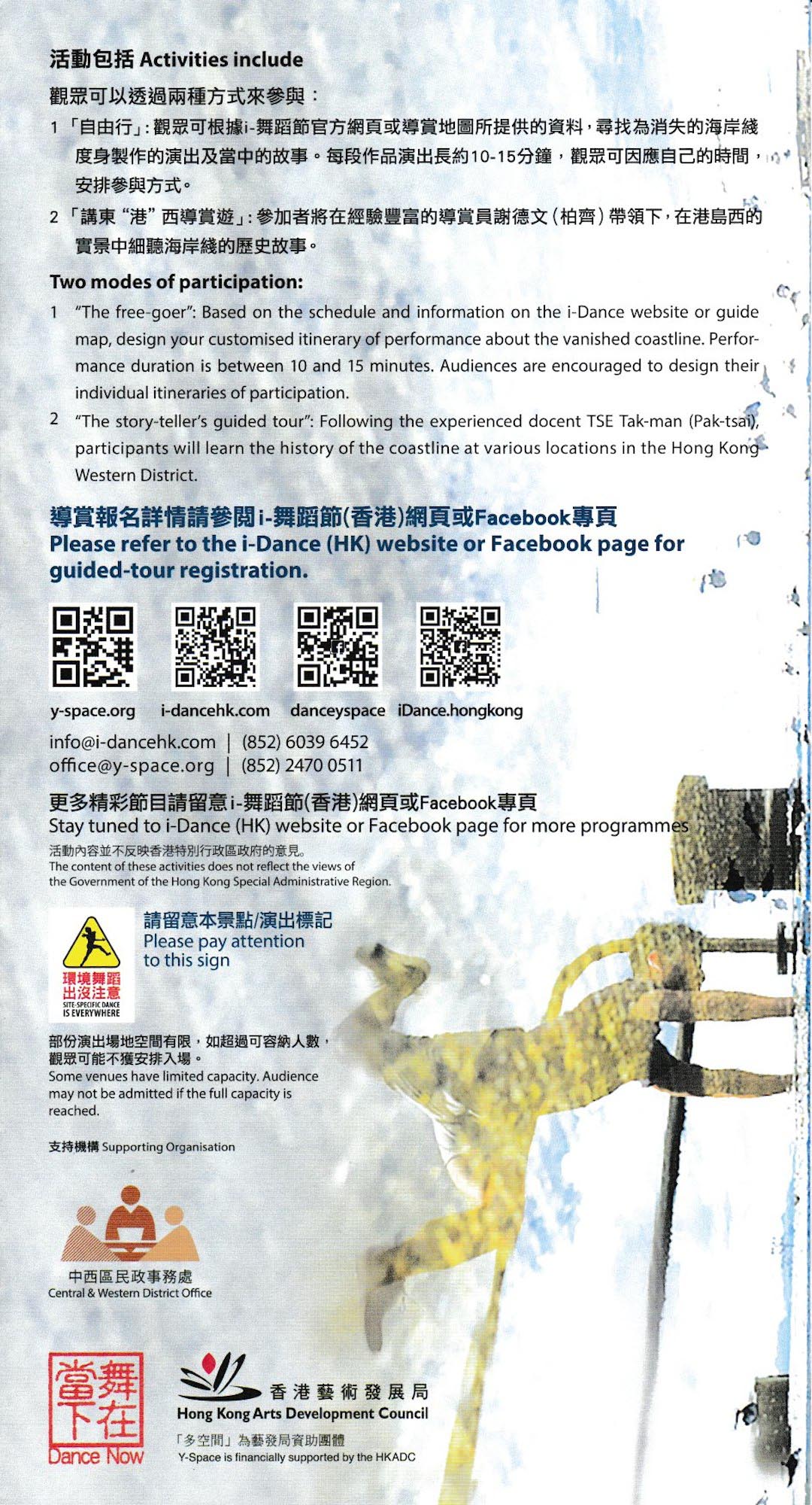 「四圍跳」這回將帶領觀衆游走於西環及堅尼地城,沿著電車軌尋找港島西失落了的文化及歷史痕跡。我們邀請多位年青編舞,於港島西選取不同的地點,進行實地考察,並因應環境特色創作一系列的環境舞蹈,觀眾會被帶離傳統劇院,跟隨著編舞的步伐,游走在不同的空間及角落,傾聽導賞員柏齊訴説港島西的大小故事,在消失中的建築環境及空間窺探傳統及歷史遺留下來的痕跡,尋找香港失去的集體回憶。