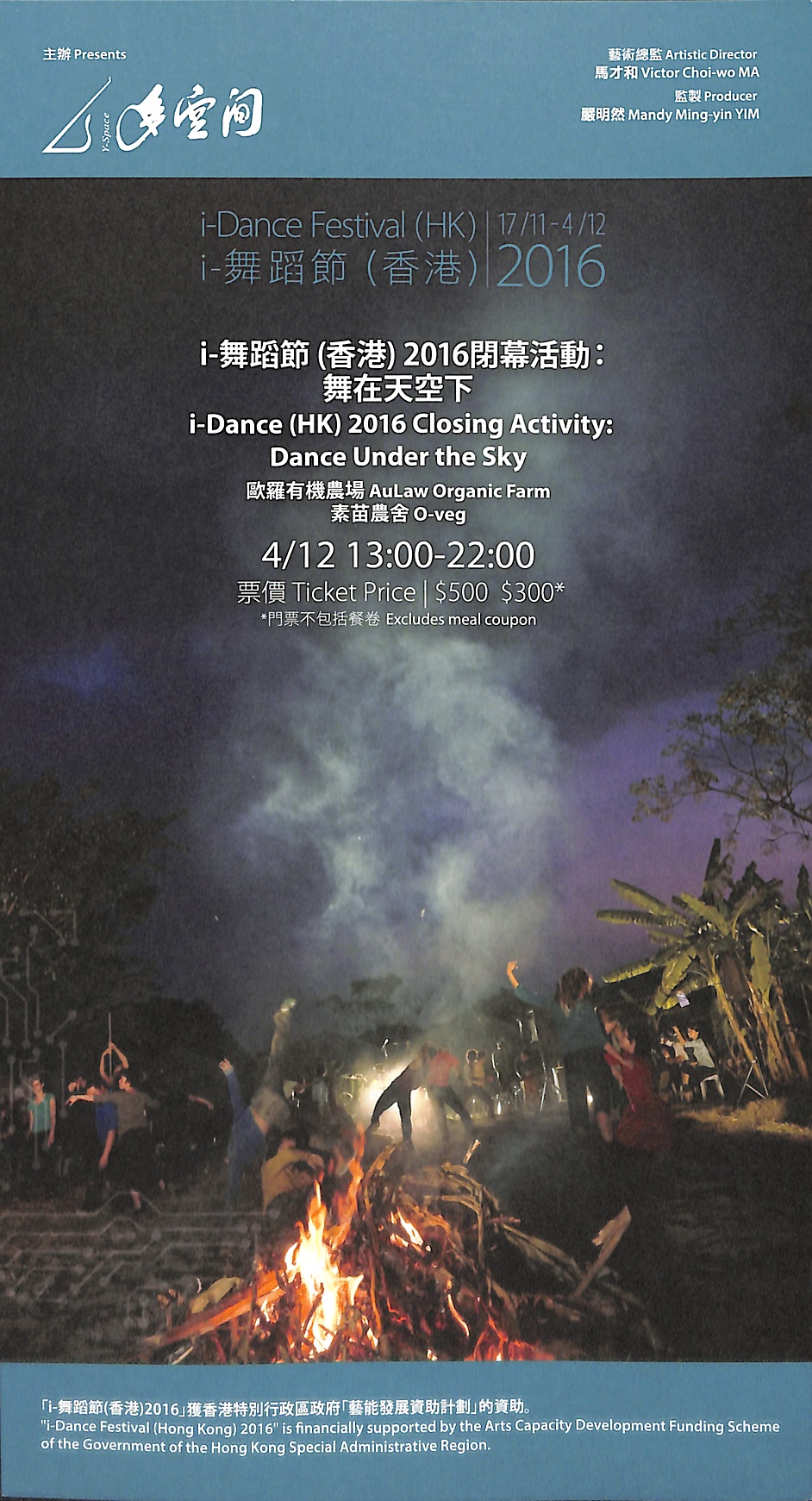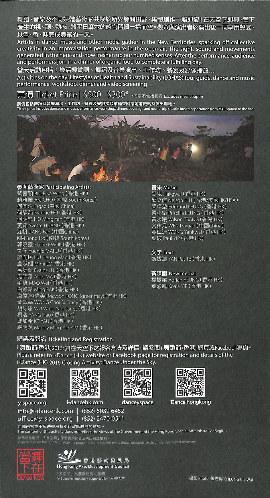 舞蹈,音樂及不同媒體藝術家共聚於新界鄉間田野,集體創作一觸即發!在天空下即興,當下產生的視、聽、動感,將平日麻木的感官習慣一掃而空。觀眾與演出者於演出後一同享用餐宴,以色、香、味完成豐富的一天。當天活動包括:樂活導賞團、舞蹈及音樂演出、工作坊、餐宴及錄像播放…