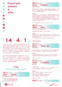 新域劇團今年採用「14•4•1」新制:「14」齣不超過2小時的作品,分十四場展演/現;「4」齣不超過45分鐘的作品,分兩場展演/現;另外,重演去年《劇場裏的臥虎與藏龍X》的其中「1」部優秀作品,並配合舞台元素,演出兩場,每場長約1小時15分鐘,讓觀眾有新的劇場體驗。