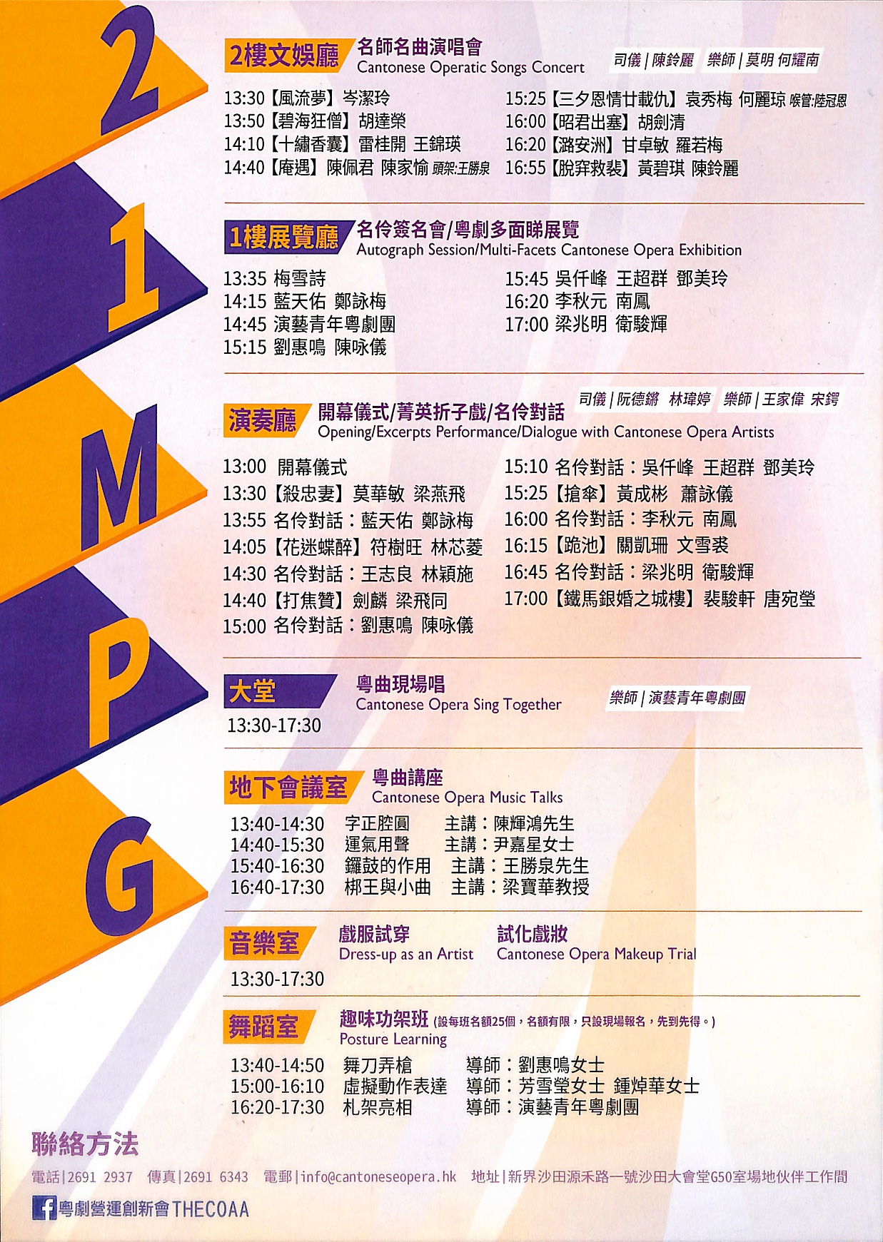 沙田粵劇同樂日來到第六個年頭,往年都係喺沙田大會堂室外廣場舉行,適逢沙田大會堂三十周年紀念,同樂日特別移施至大會堂室內舉行!當日將特別開放各個樓層予公眾參加同樂日嘅活動!精彩節目包括:菁英折子戲名伶簽名會名師名曲演唱會趣味功架班戲服試穿試化戲妝 粵曲講座粵曲現場唱