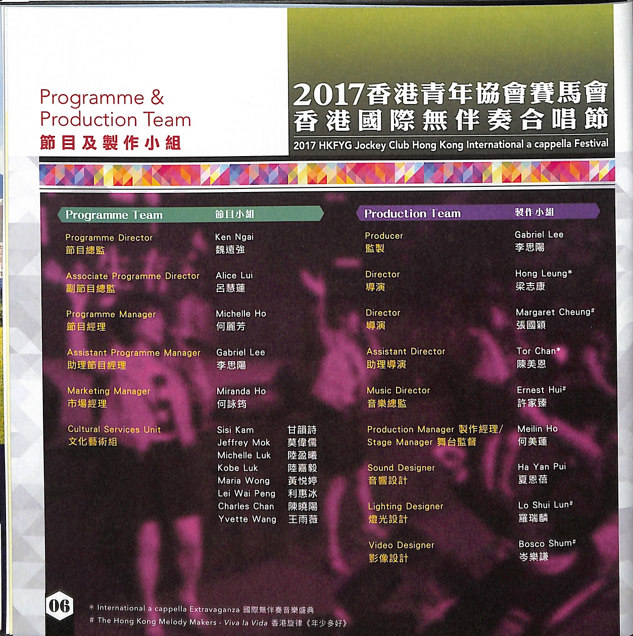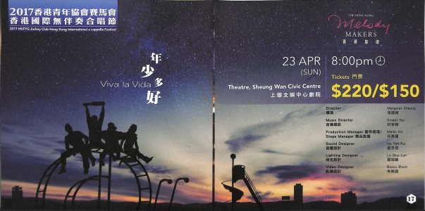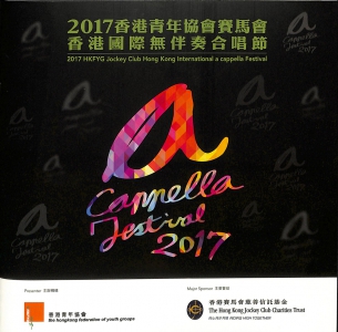 香港青年協會繼續獲香港賽馬會慈善信託基金擔任主要贊助,舉辦「2017香港青年協會賽馬會香港國際無伴奏合唱節」,是次邀請到來自世界各地的著名無伴奏合唱隊伍雲集香港,包括來自澳洲Drums of War、菲律賓Acapellago、英國的The Techtonics、合唱節大使JW王灝兒、青協香港旋律及合唱學生領袖訓練計劃之學員一同踏上伊利沙伯體育館的舞台,將為觀眾帶來精彩的演出。