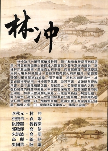林冲為八十萬禁軍槍棒教頭,與花和尚魯智深是結拜兄弟。其妻在東嶽廟上香時被太尉高俅之義子高衙內調戲,幸獲林冲趕至解圍。高衙內心有不甘,向高俅進讒,高俅使計用寶刀騙取林冲信任,並命其攜帶寶刀前來相見,郤誤導其闖入軍事禁地白虎堂,犯下重罪,將林冲剌配滄州。其妻貞娘柳亭送別,林冲寫下休書,郤其再嫁,貞娘斷然拒收休書,立下生死相隨之誓。發配路上,公差受高衙內之托,在野豬林將林冲剌殺,幸得魯深相救。魯智深勸林冲同上梁山,林冲以曾受朝廷俸祿,不能落草為寇,婉言拒絕。到了滄州,高俅又派人火燒由林冲看守的草場。林冲剛巧在外打酒,避過一劫,郤難保草場,更得知妻子為保貞節已自盡,憤恨之極,在山神廟怒殺陸謙等人,風雪上梁山。