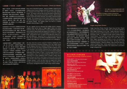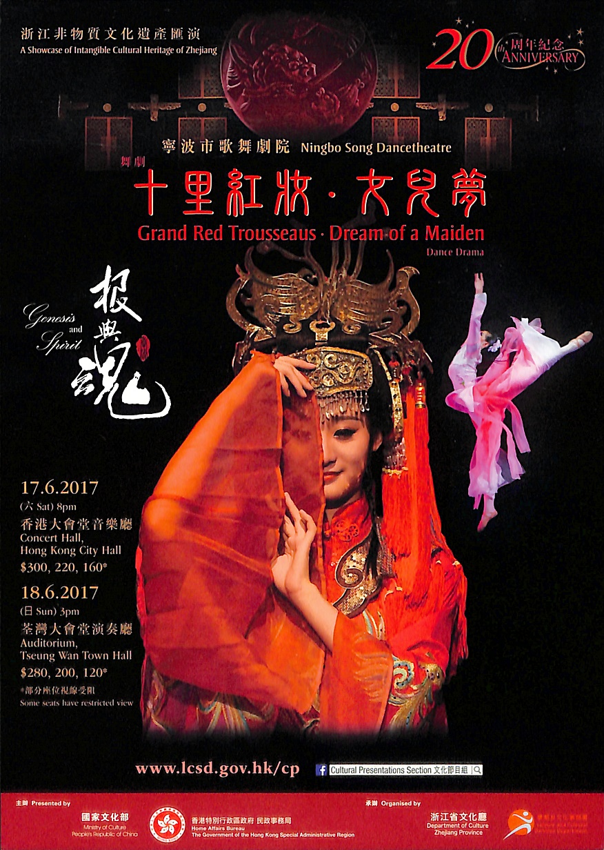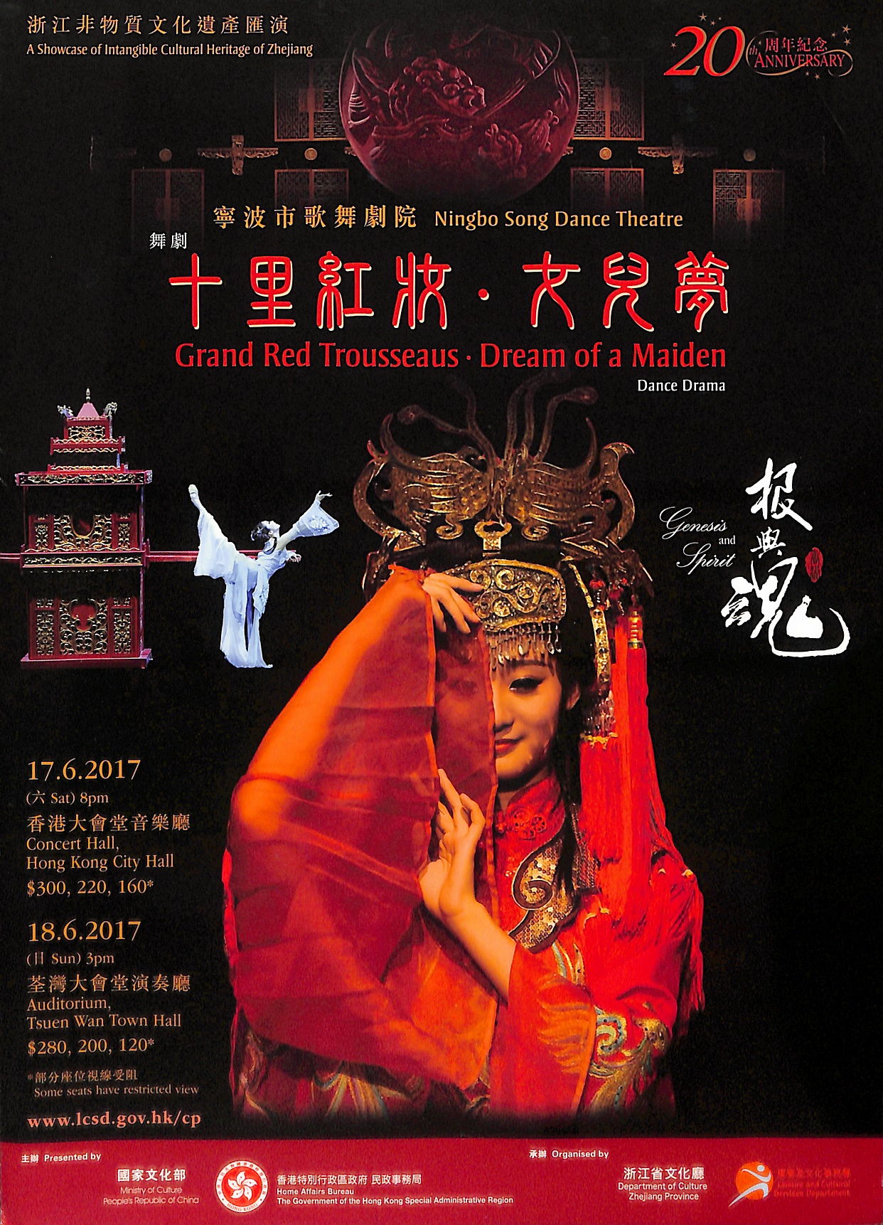 一部江南女子忠貞愛情的讚美詩一幅浙江民間婚嫁習俗的風情畫 《十里紅妝 ‧ 女兒夢》是一部反映浙東民俗風情的大型舞劇,脫胎於千百年來的江南婚嫁民俗和寧波幫走南闖北的歷史。以清末民初江南古鎮一對年輕男女的愛情為主線,用「夢戀」、「夢別」、「夢歸」及「夢嫁」四幕講述了一個大家閨秀忠貞不渝的愛情傳奇。 阿甬和越兒自小青梅竹馬,在豆蔻之年互訴芳心。「等我回來,做我的新娘」阿甬的一句承諾譜寫了越兒的思念等待,永恆不變、守望於此的十里紅妝 ‧ 女兒夢。